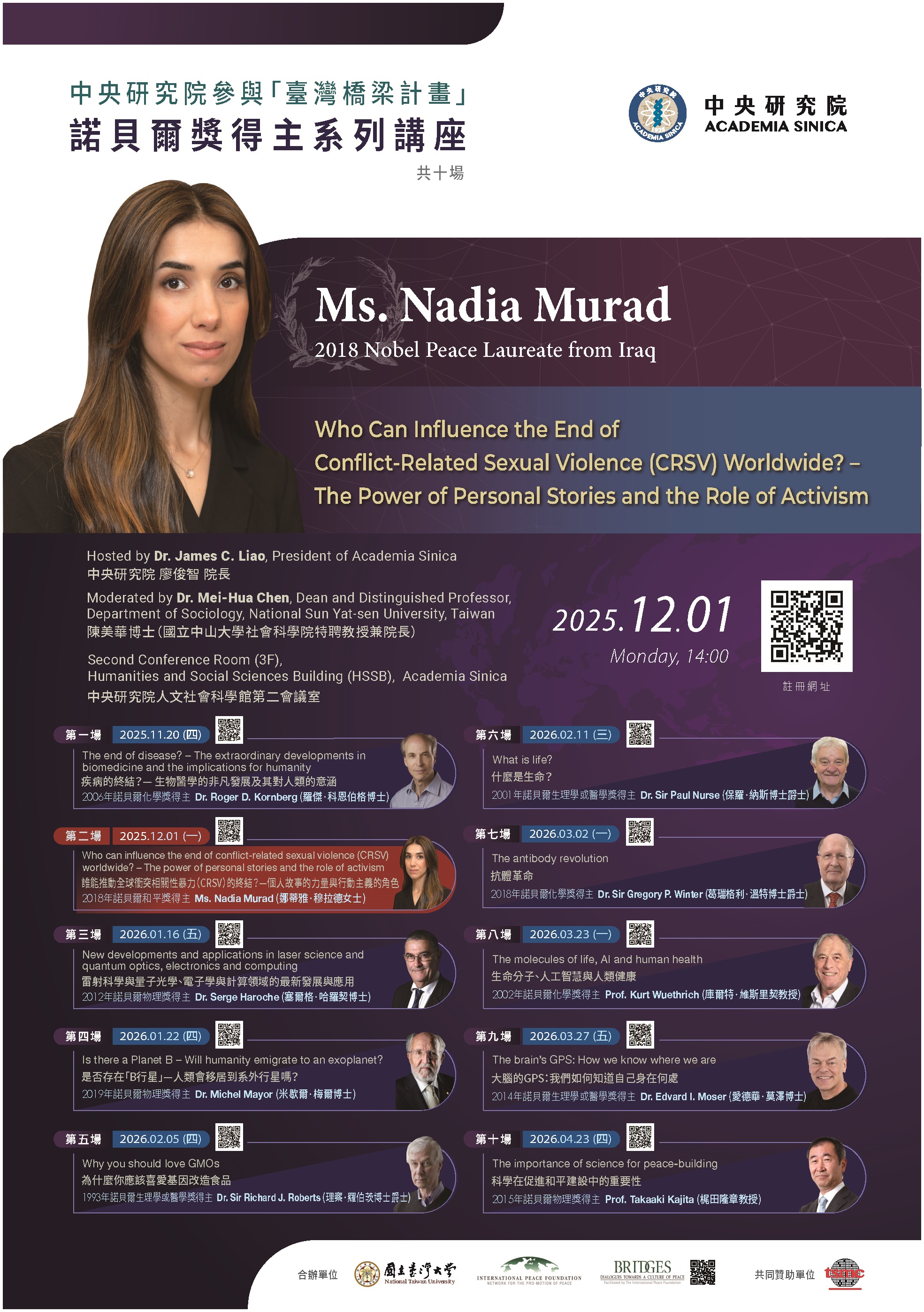 【中央研究院 書函】本院參與「臺灣橋梁計畫」(TAIWAN BRIDGES)邀請諾貝爾和平獎得主娜蒂雅.穆拉德女士(Ms. Nadia Murad)蒞院發表專題演講
