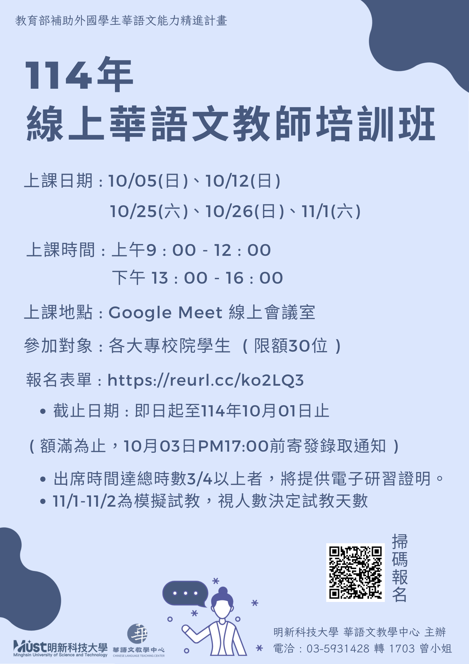 【師資培訓】114-1 教育部精進計畫華語師資培訓班