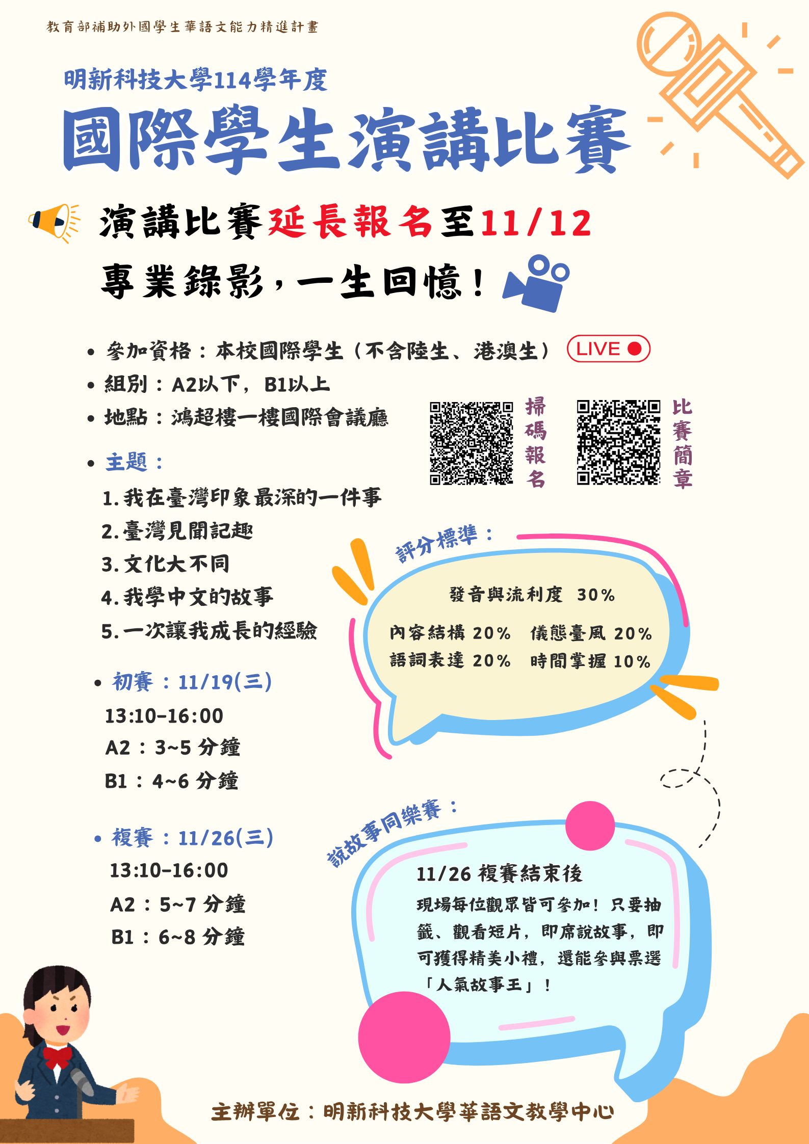 【活動報導】 114學年度國際學生華語文演講比賽熱烈報名中!(延長報名至11/12)