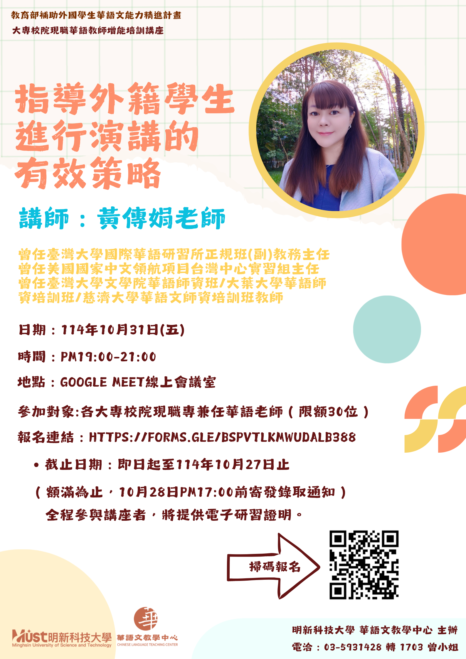 【教師增能】114-1華語文教學中心教師增能培訓講座:指導外籍學生進行演講的有效策略