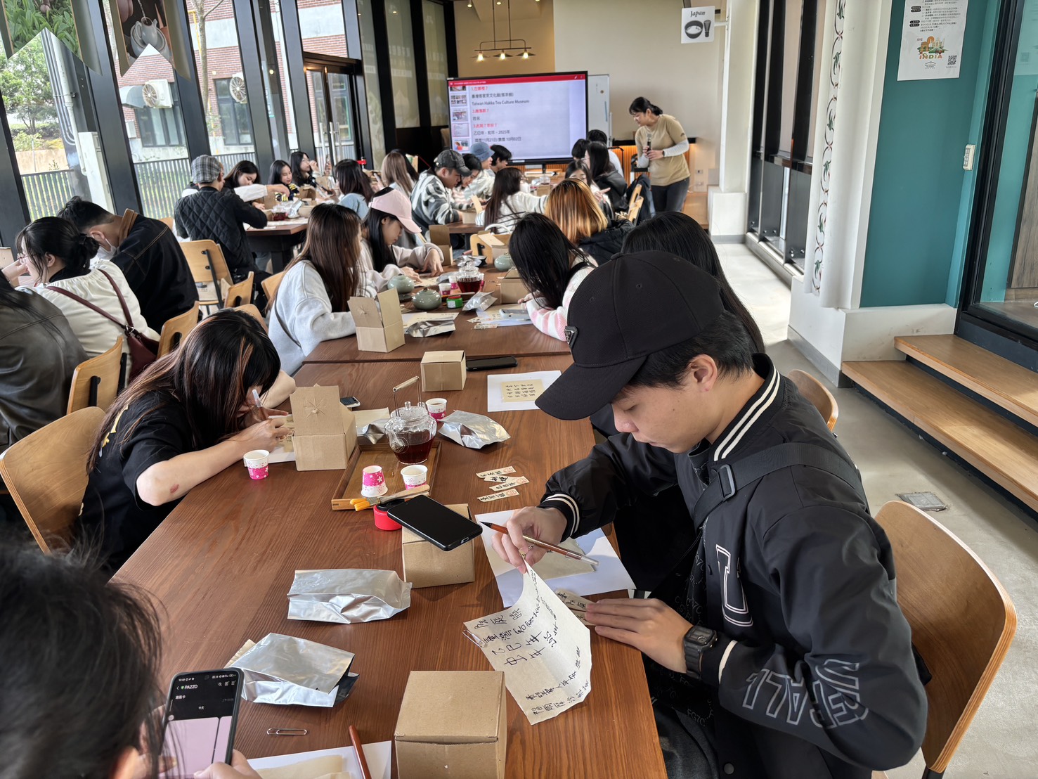 上午行程安排至客家茶文化館,館內透過專業導覽介紹臺灣茶文化的發展脈絡與客家藏茶傳統,讓學生了解茶在臺灣生活與文化中的重要地位。活動中特別安排藏茶體驗,並結合書法創作,邀請學生以毛筆書寫新年期許,在品茶與書寫之間,感受傳統文化的靜謐與深度。