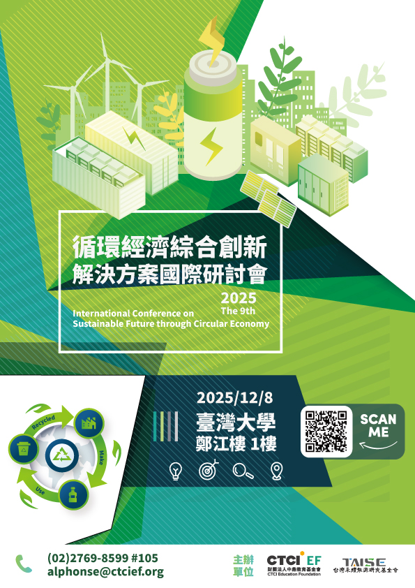 一、為促進循環經濟的發展,中鼎教育基金會、國立臺灣大學,共同主辦「2025第九屆循環經濟綜合創新解決方案國際研討會」
