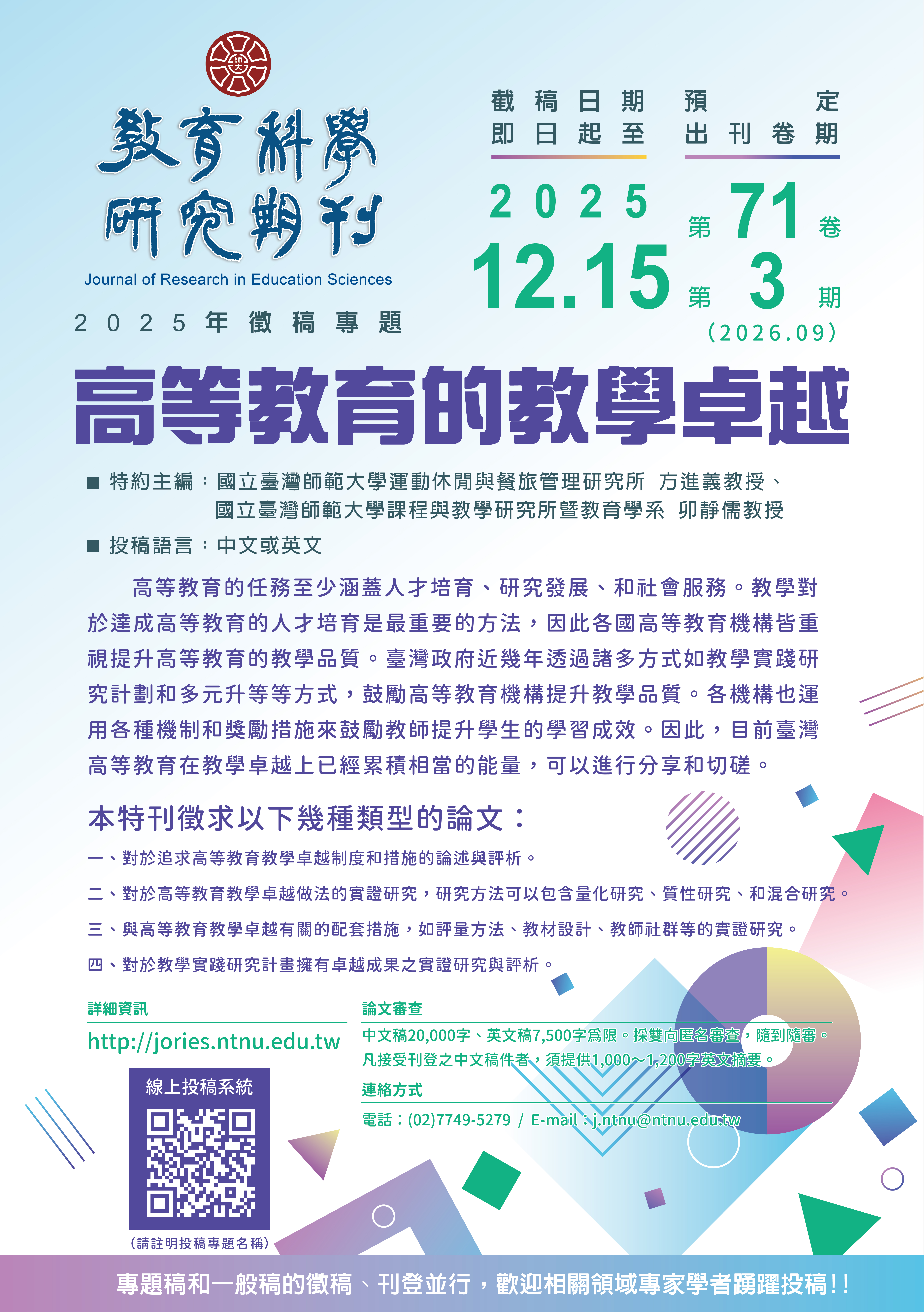 國立臺灣師範大學 《教育科學研究期刊》專題徵稿主題「高等教育的教學卓越」延長
