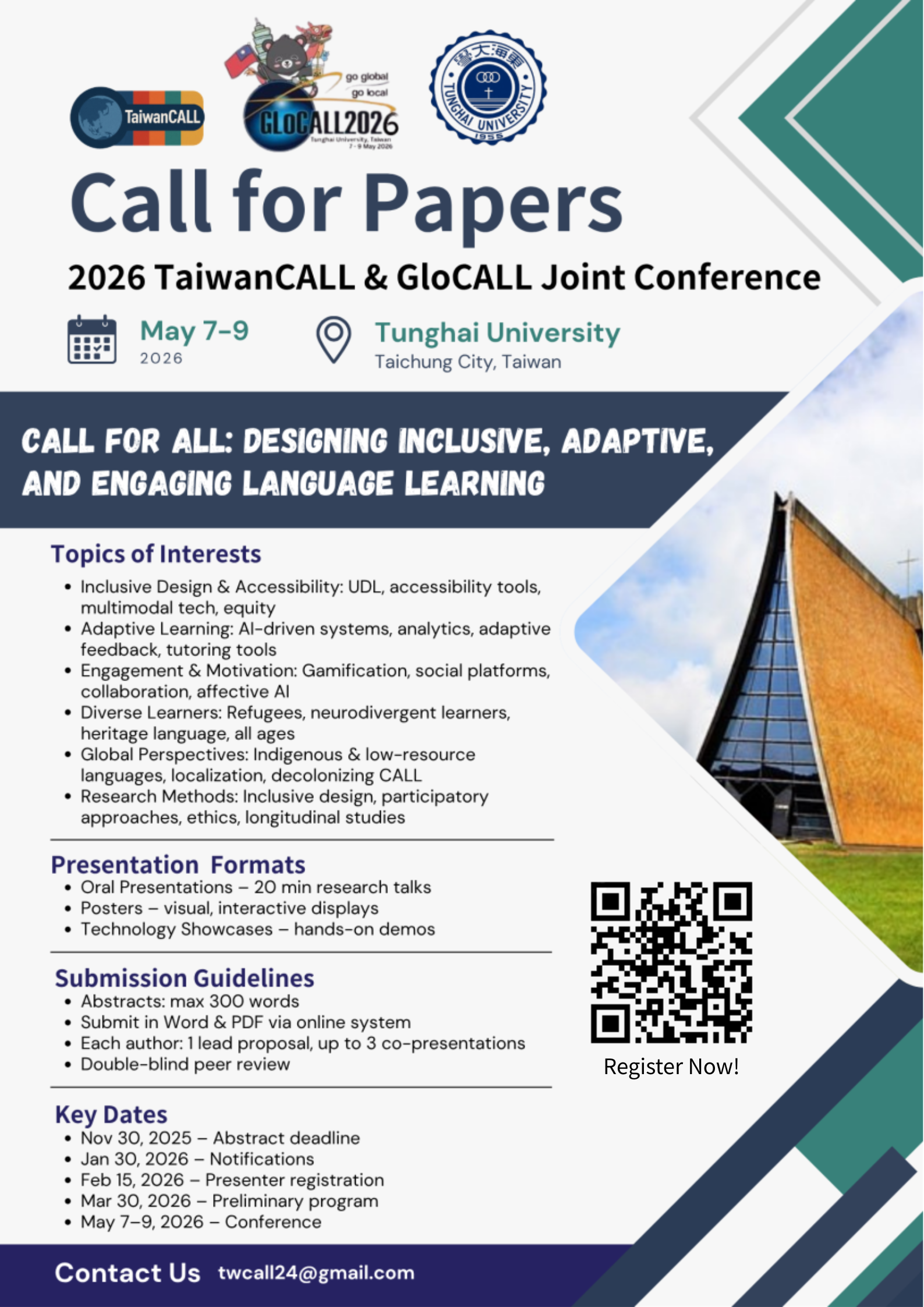東海大學 「2026臺灣電腦輔助語言學習學會暨全球電腦輔助語言學習國際研討會」