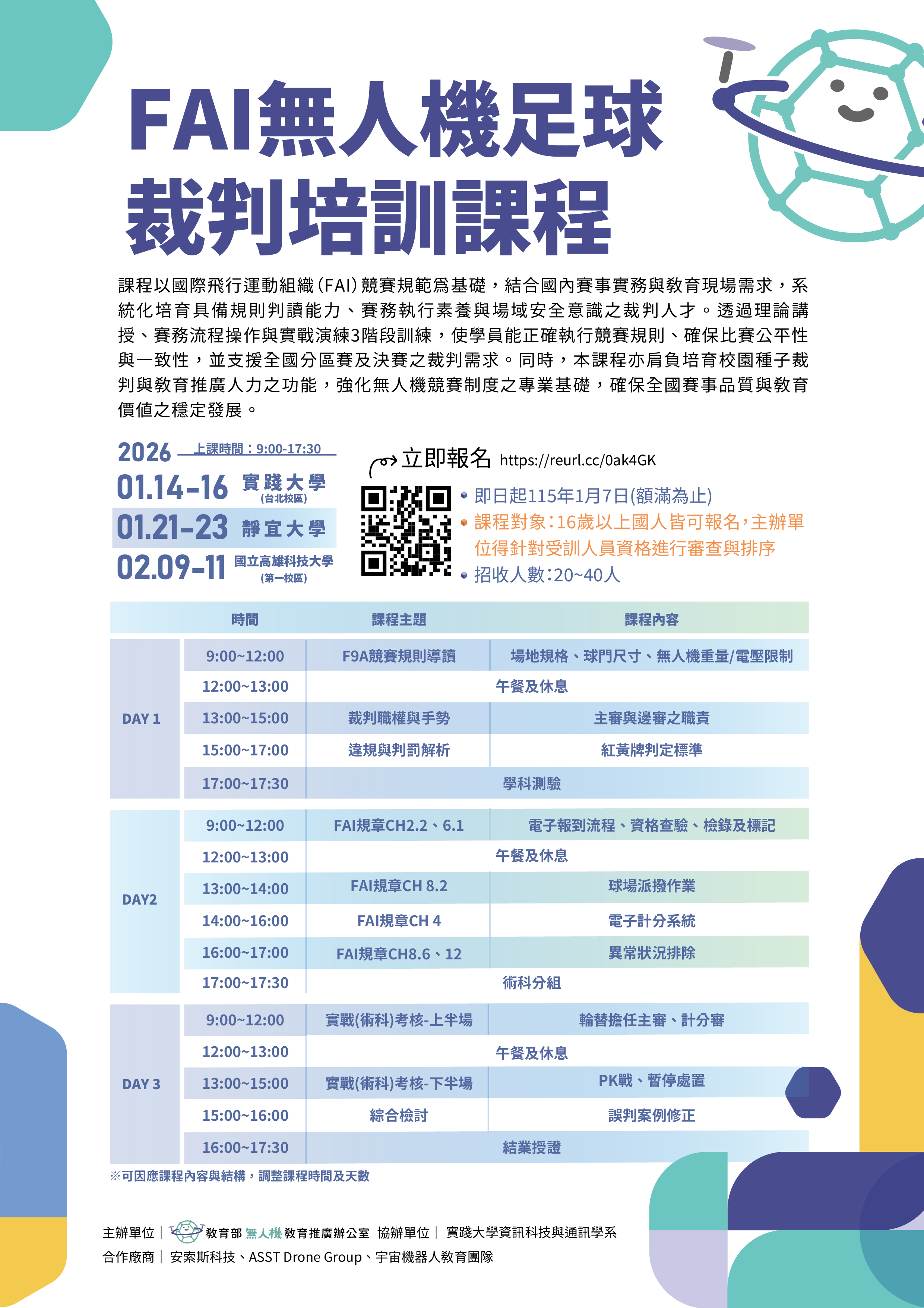 主旨:有關教育部無人機教育推廣辦公室辦理「FAI無人機足球裁判培訓課程」,敬請協助公告,邀請貴校教師及學生踴躍報名參加,請查照。