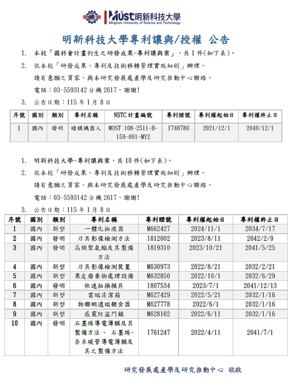 明新科技大學專利讓與/授權 公告