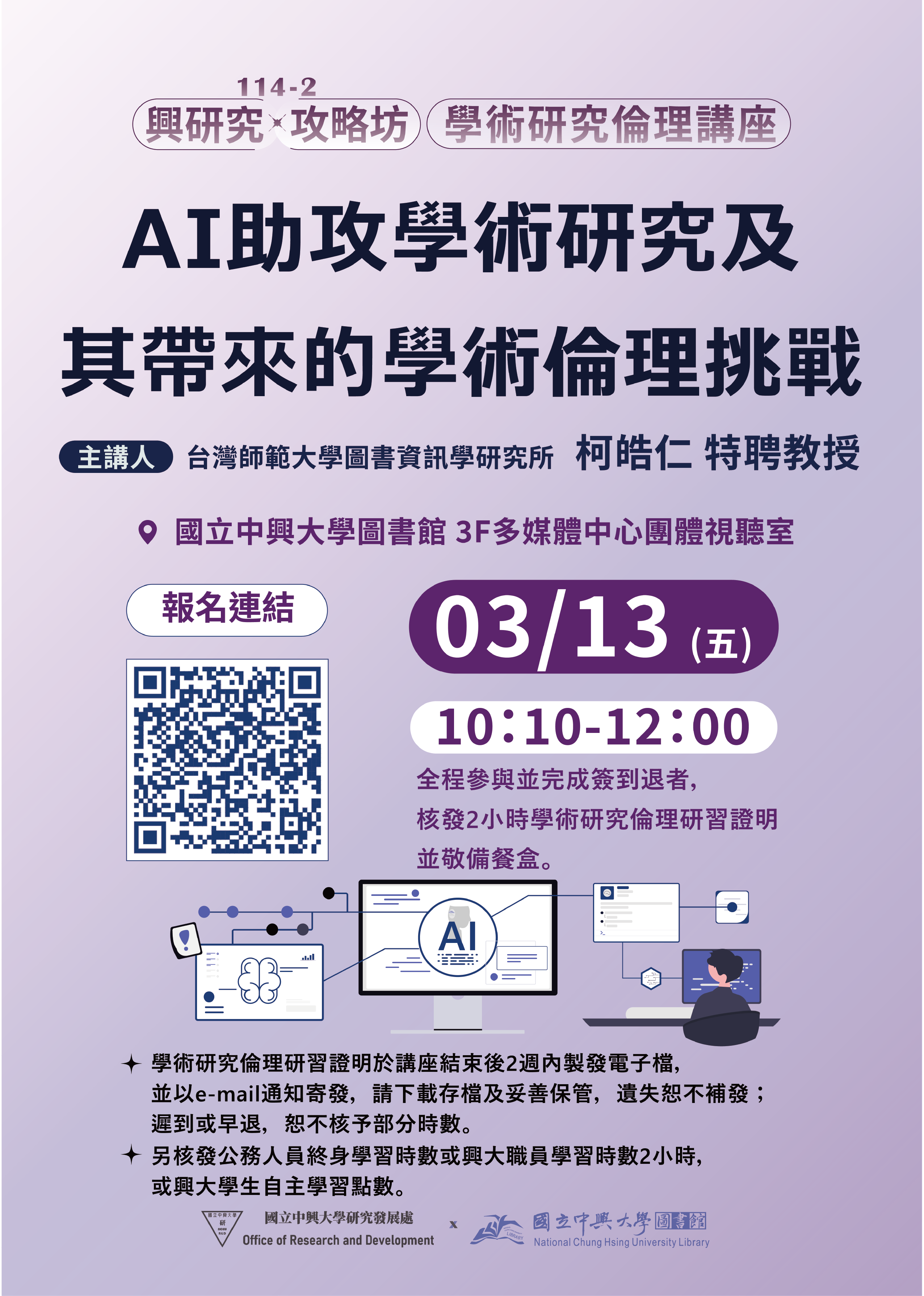 (一)講題:AI助攻學術研究及其帶來的學術倫理挑戰。