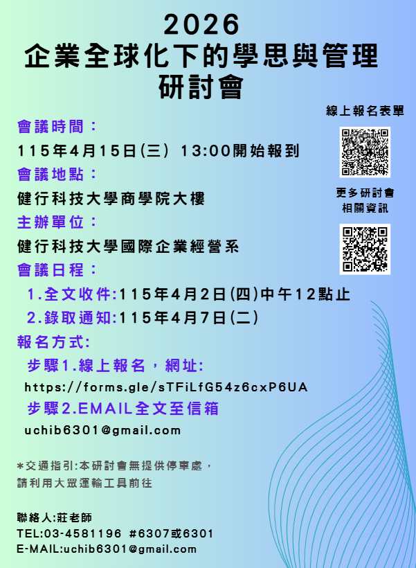 本校國際企業經營系謹訂於115年4月15日(星期三)舉行『企業全球化下的學思與管理』研討會,即日起徵稿,請惠予公告並鼓勵貴校師生踴躍投稿,請查照。