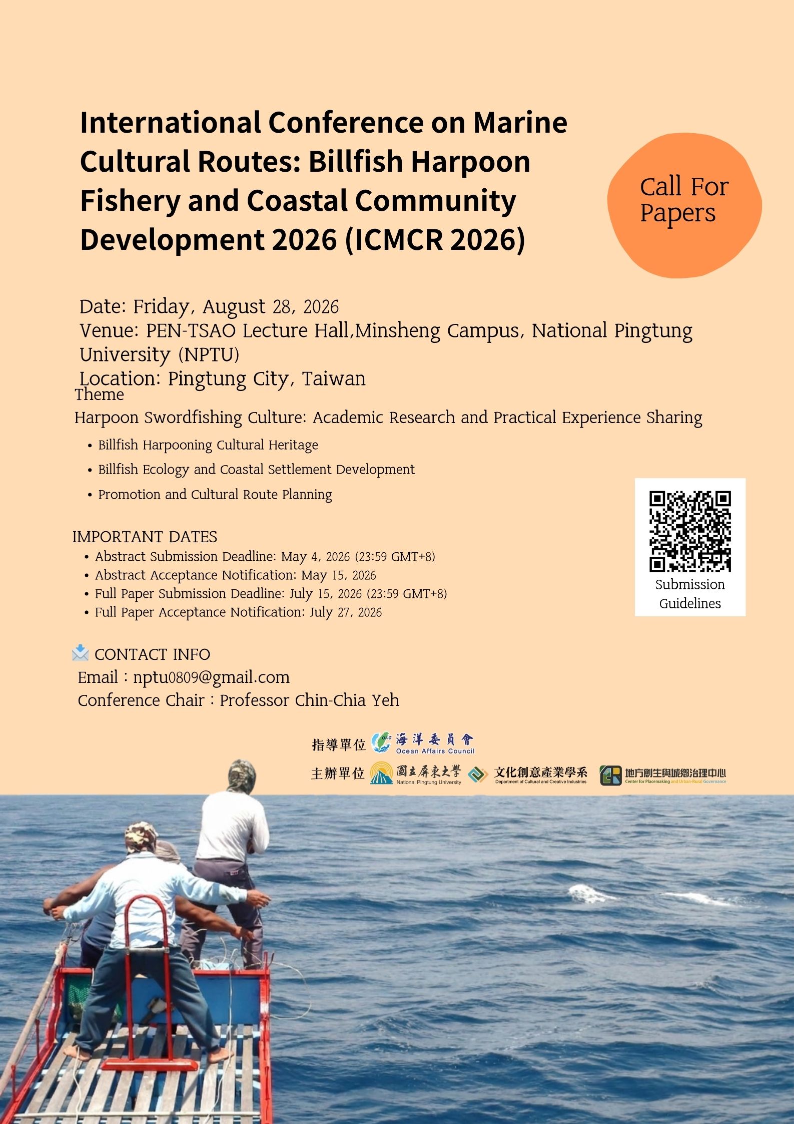 旨揭研討會係由海洋委員會補助辦理,邀請國內外相關領域學者專家、研究人員及研究生投稿參與。徵稿主題包含:鏢旗魚文化資產、旗魚生態與海岸聚落發展、鏢旗魚文化推廣與文化路徑等相關議題。