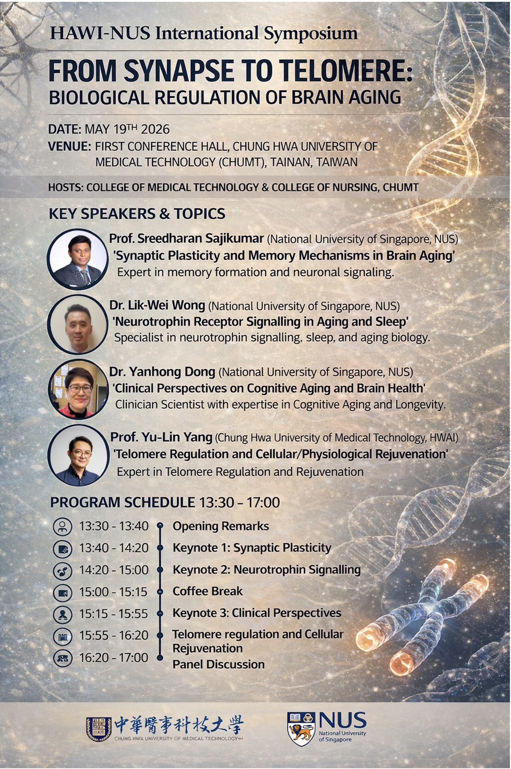 中華醫大謹訂於115年5月19日(星期二)下午13時30分至17時00分,舉辦「HAWI–NUS國際研討會:從突觸到端粒-腦部衰老的生物調控」。