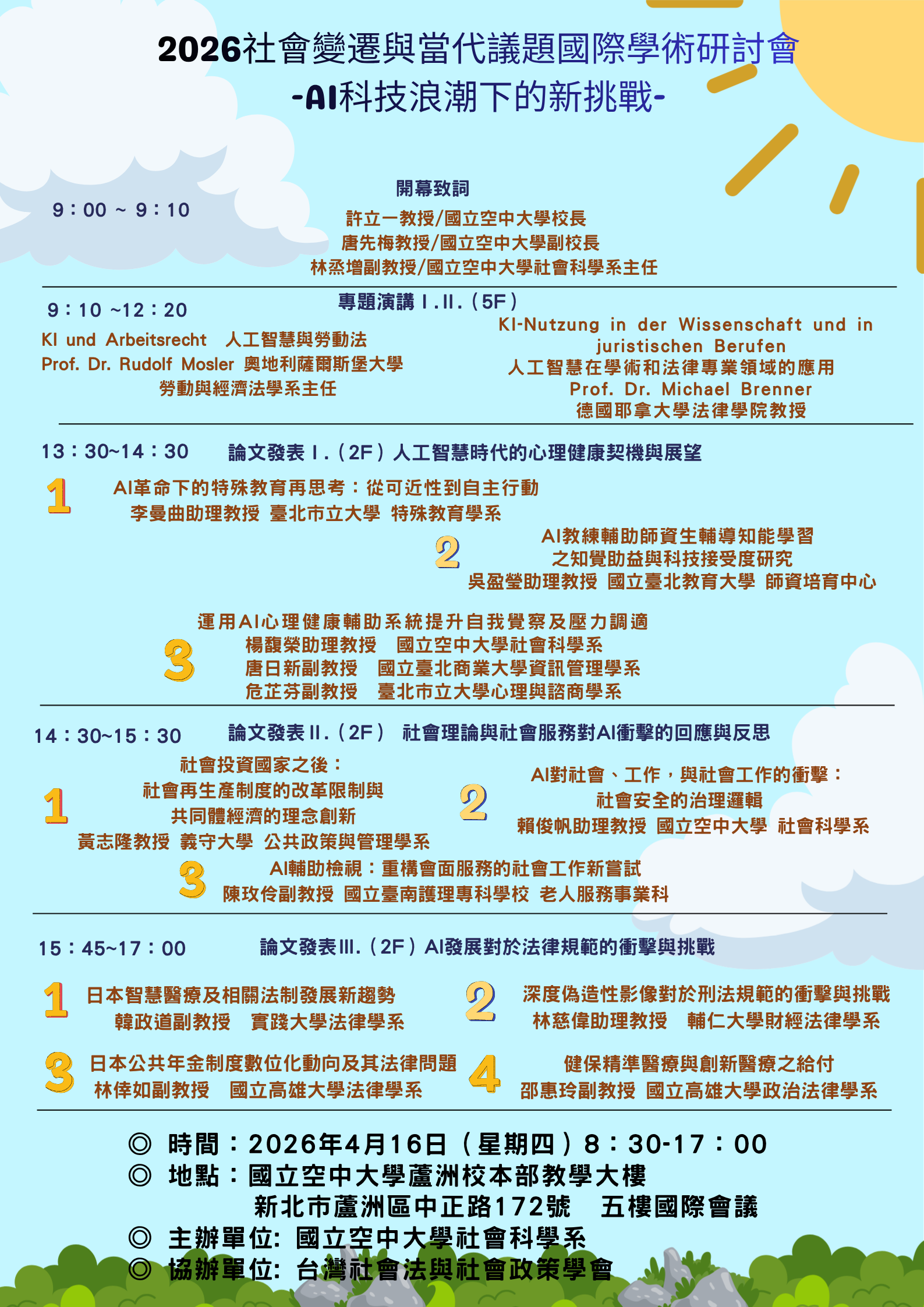 本校社會科學系訂於115年4月16日(星期四)舉辦「2026社會變遷與當代議題-AI科技浪潮下的新挑戰」國際學術研討會,敬請惠予公告,並鼓勵貴校師生踴躍參與,請查照。