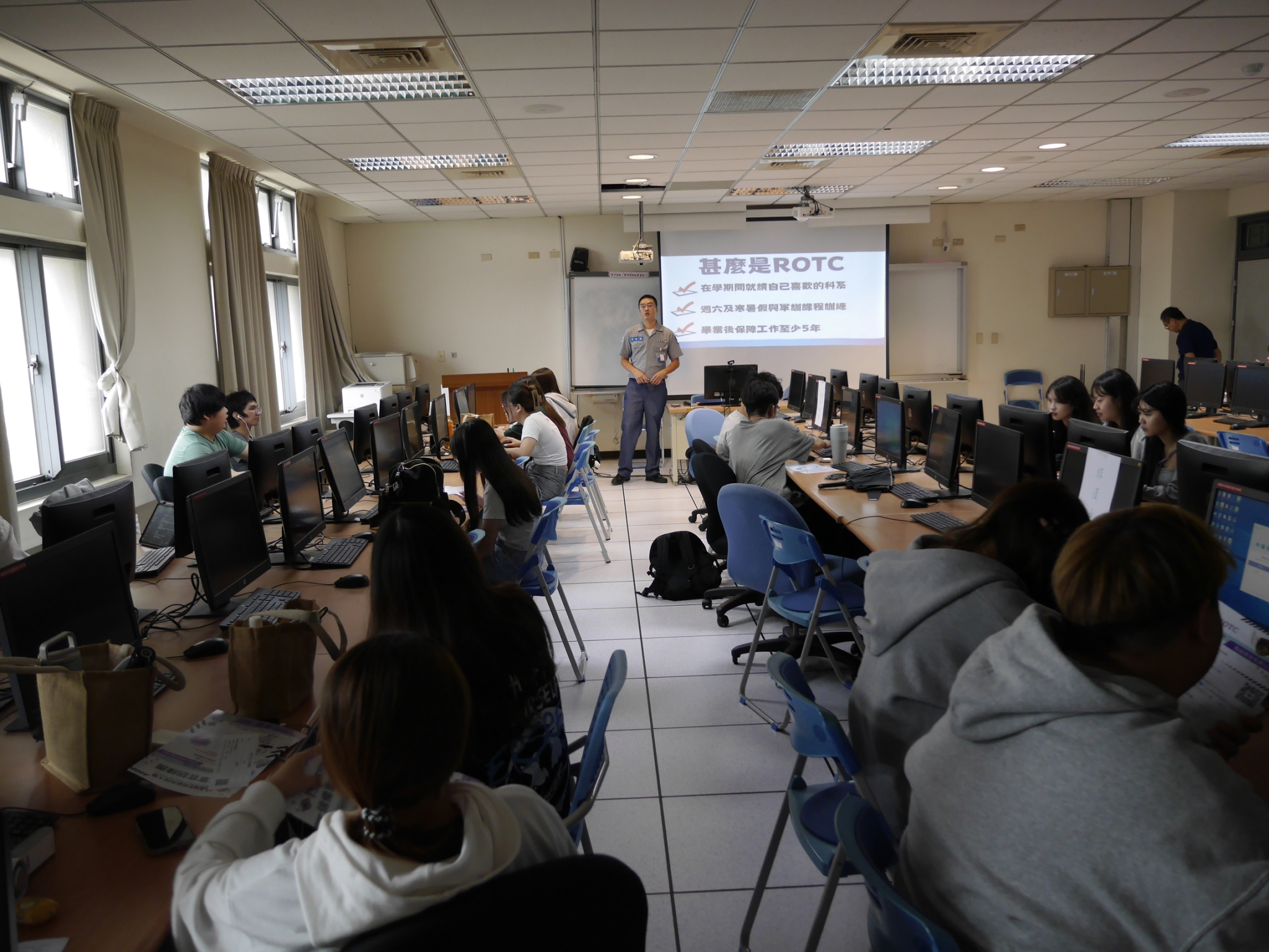 由於本校歷年對一年級新生同學,分別採取新生說明會、進班宣導等等不同宣導管道,除讓一年級新生同學及授課老師等也了解相關優惠規定,進而全力支持鼓勵同學透過ROTC招募,加入國軍行列。 23日經過本中心同仁與國軍新竹招募站團隊日以繼夜共同合作努力下,完成七個班次招生宣導,成效良好。