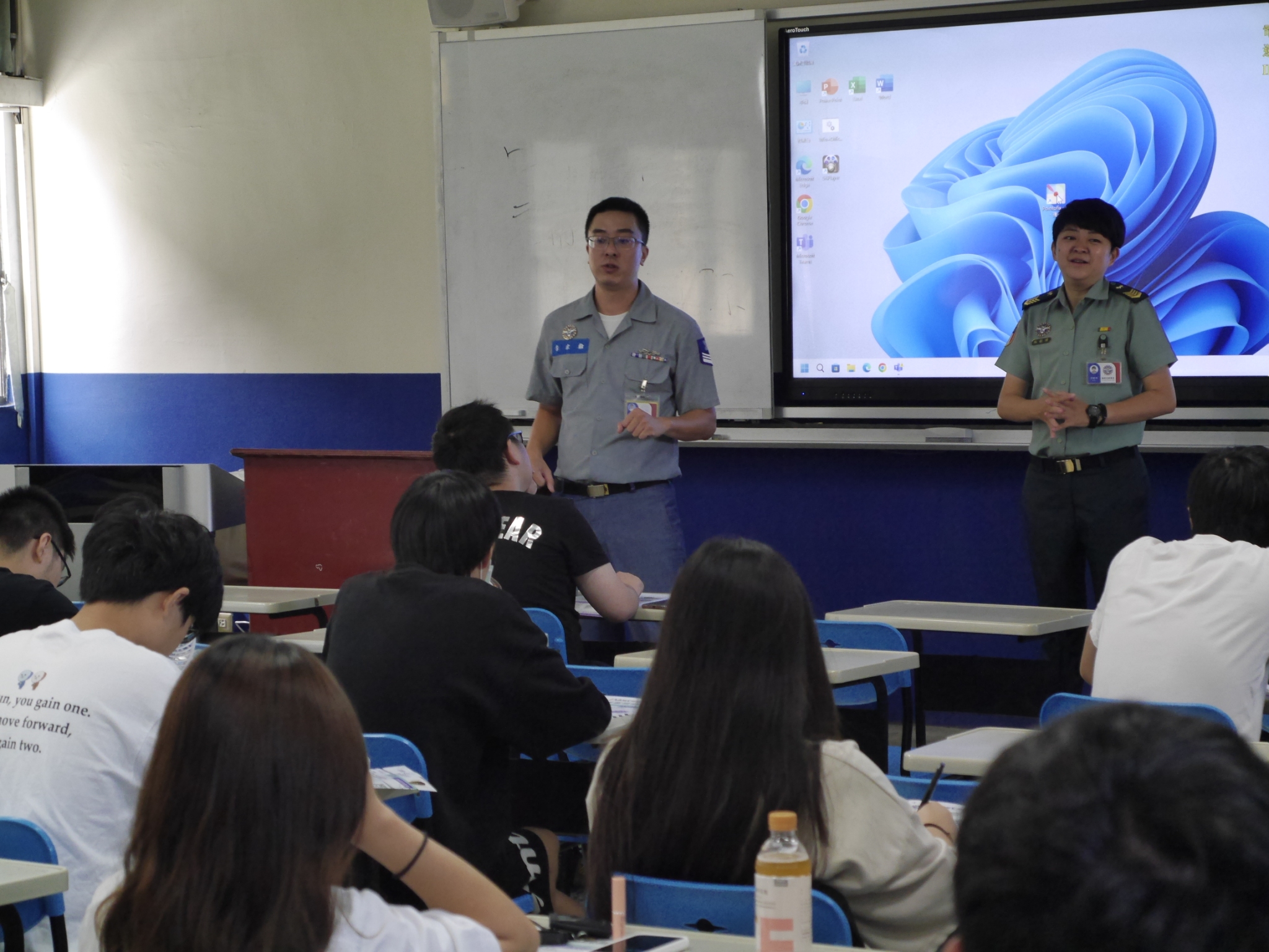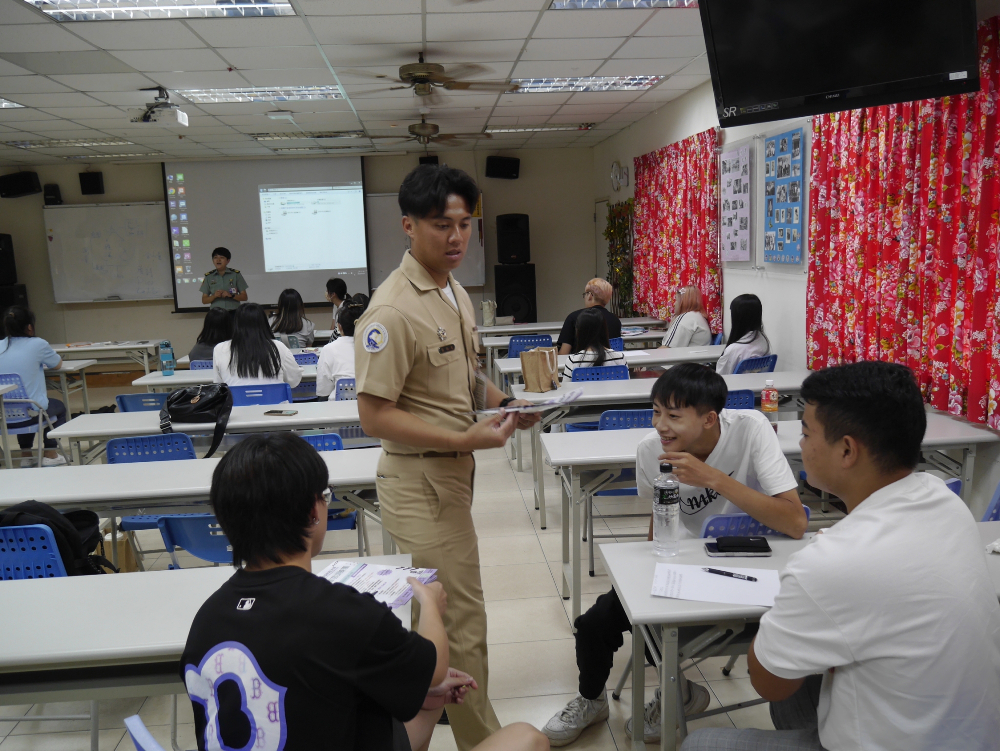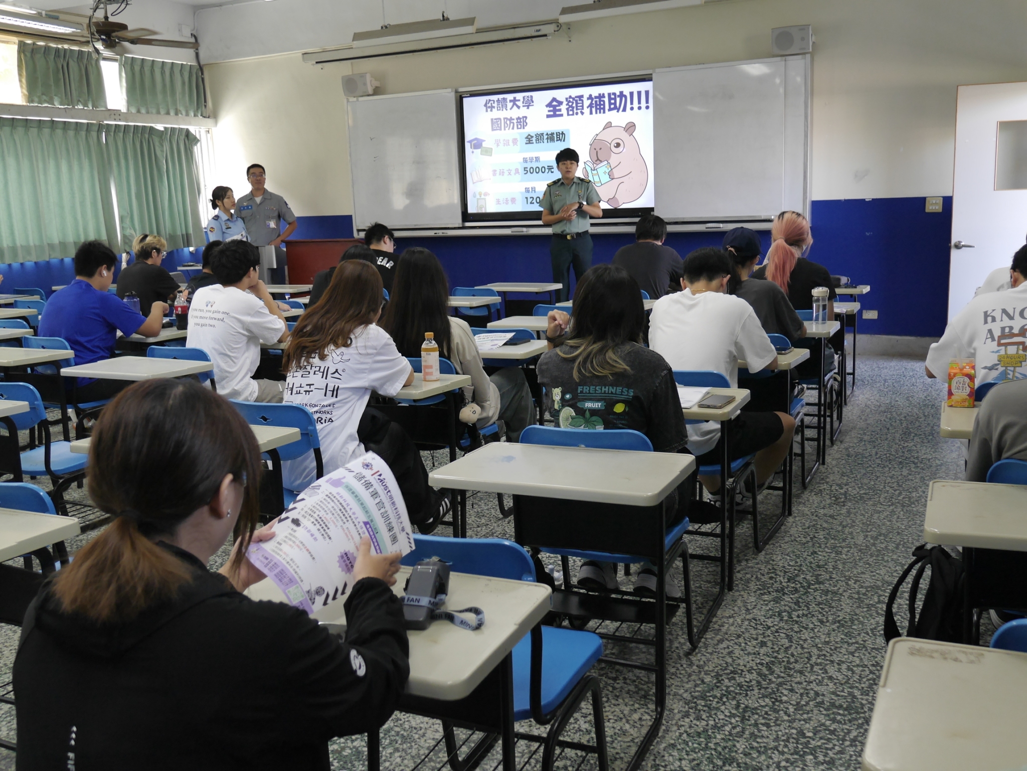 招募作業進行到第3天,多數授課老師在了解ROTC的招生相關規定後,均表示支持與鼓勵同學藉此管道,加入國軍行列,達到就學即就業的目標;在炎熱的氣候下,要完成日夜間部招生宣導,對同仁的體力的確是艱辛的考驗,但大家齊心努力達到每日計畫目標。