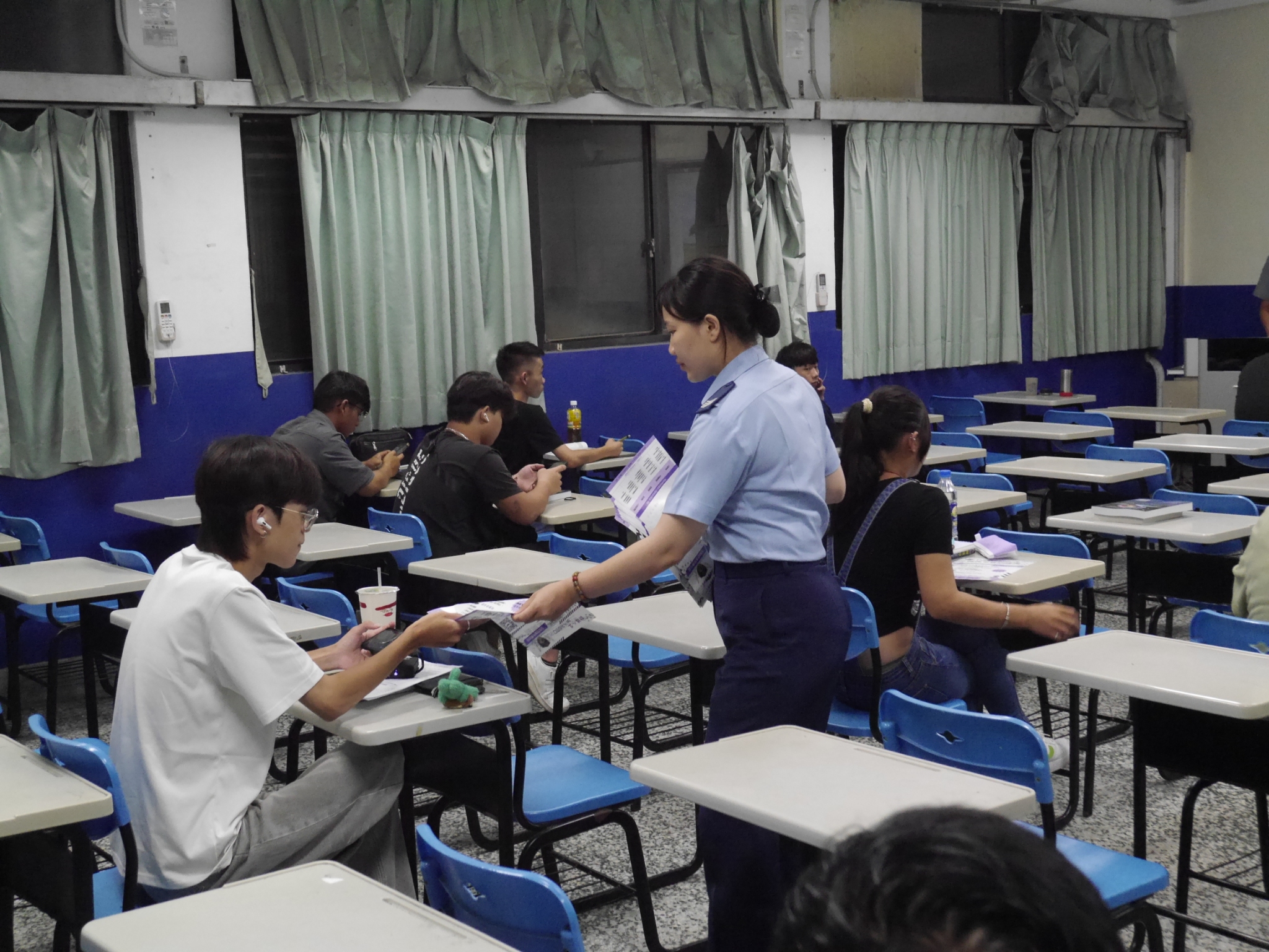 24日(三)當日,國軍新竹招募站副站長林敏琪上士,特別蒞臨本校除慰勞招募站同仁的辛勞,亦一同加入招募的行列,除提振士氣外,對提升招募成效定有助益。