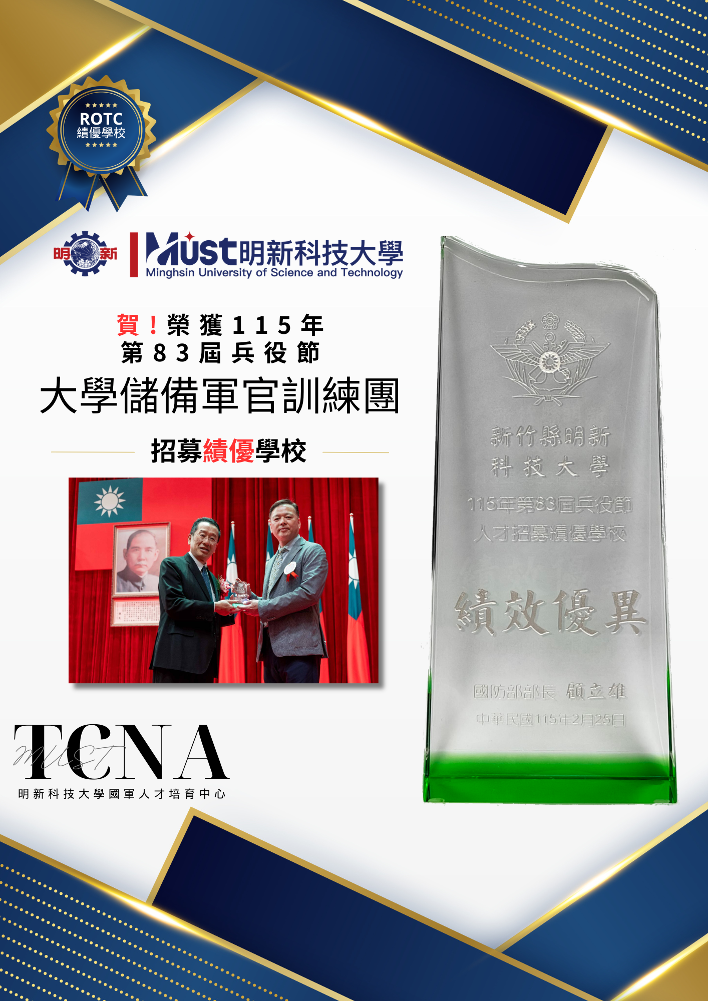 【獲獎】🍀本校獲頒115年儲備軍官訓練團招生績優單位🎉