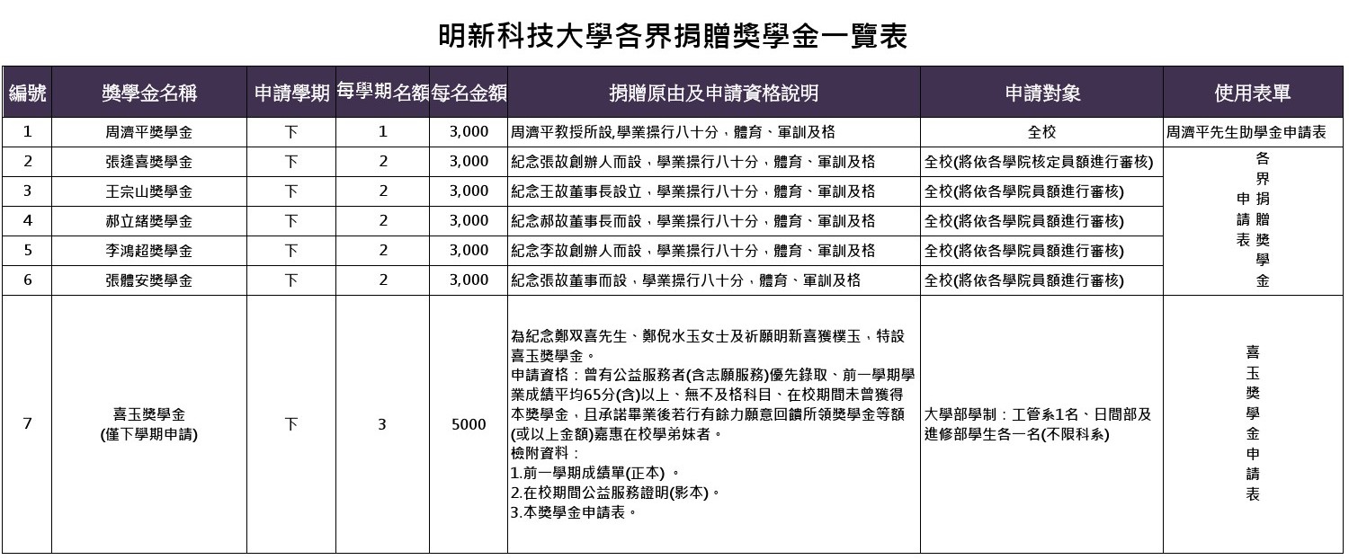 一、申請時間:115年3月2日至3月20日止,逾期恕不受理。 二、表格請自行下載:生輔組→下載專區→獎學金專區→校內獎學金→各界捐贈獎學金申請表。 三、114-2書卷獎學金、勤學獎學金、勵學獎獎學金不需自行申請,生輔組會依前學期成績及符合資格標準審查。 四、獎學金採匯入帳戶方式發放,請務必上網登錄設立轉帳帳戶。