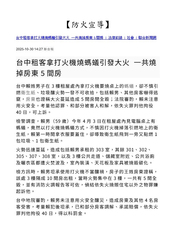 台中賴姓男子在3樓租屋處內拿打火機要燒桌上的螞蟻,卻不慎引燃衛生紙、垃圾釀火勢一發不可收拾,包括賴男、其他房客嚇得逃竄,房東也證稱大火蔓延造成5間房間全毀;法院審酌,賴未注意用火安全,考量他認罪、和部分被害人和解,依失火罪判他拘役40日,可上訴。