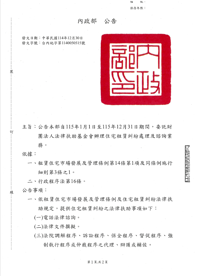 【公告】內政部委託財團法人法律扶助基金會自115年1月1日至115年12月31日期間,辦理住宅租賃糾紛處理及諮詢業務