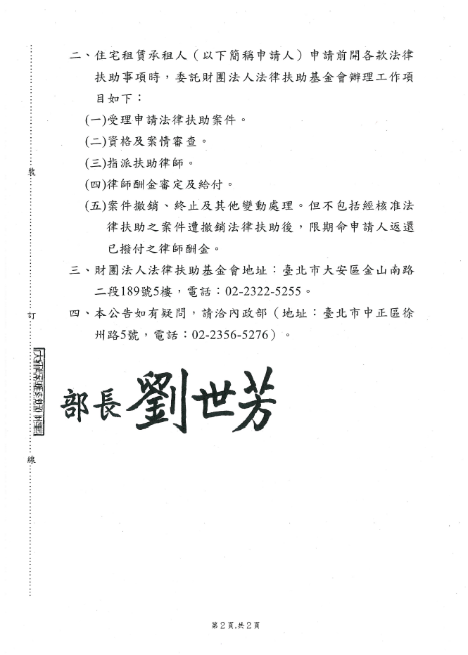 - 三、財團法人法律扶助基金會地址:臺北市大安區金山南路二段189號5樓,電話:02-2322-5255。