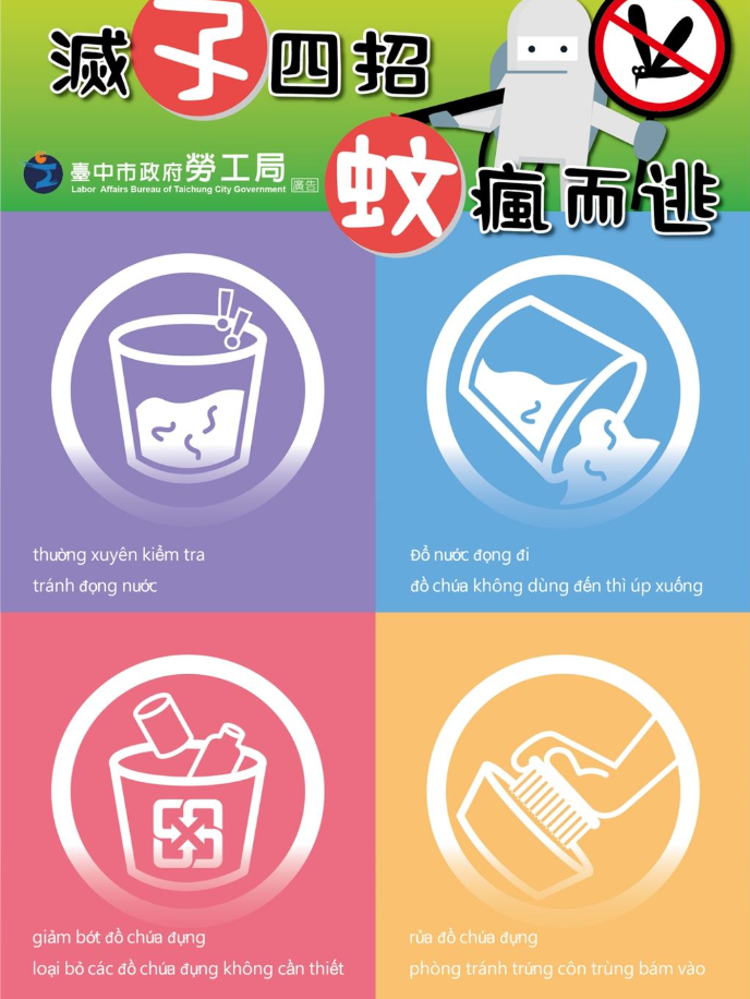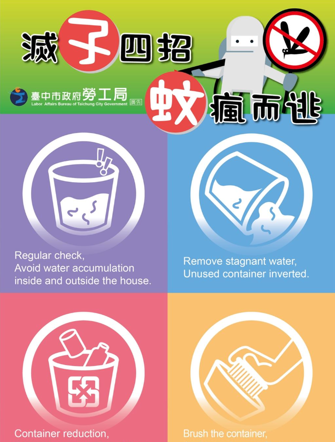 1. 登革熱、日本腦炎、屈公病及茲卡病毒等病媒蚊,防治首重環境清理及清除孳生源,敬請師生主動清除住處及辦公處所之可能的孳生源。