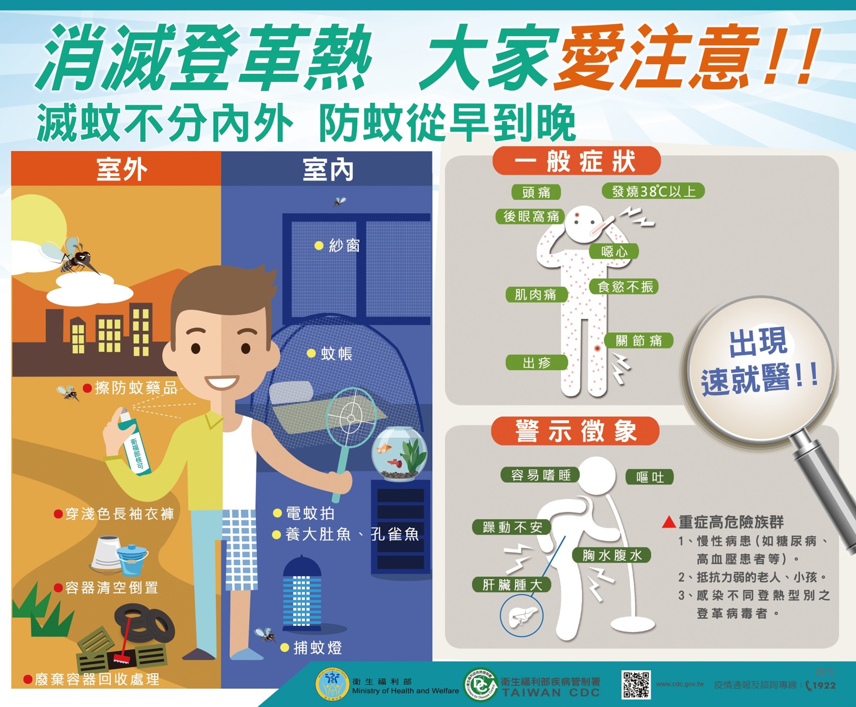 3. 出國入境後應自主健康監測14天,如出現發燒、頭痛、後眼窩痛、肌肉關節痛、出疹等症狀時,應儘速就醫,並主動告知醫師旅遊史