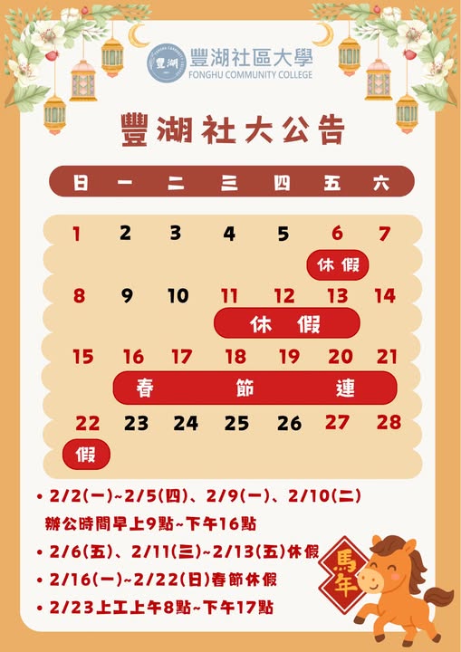 🐎🧧豐湖f社區大學《年節休假公告》🧧🧨🧨🧨