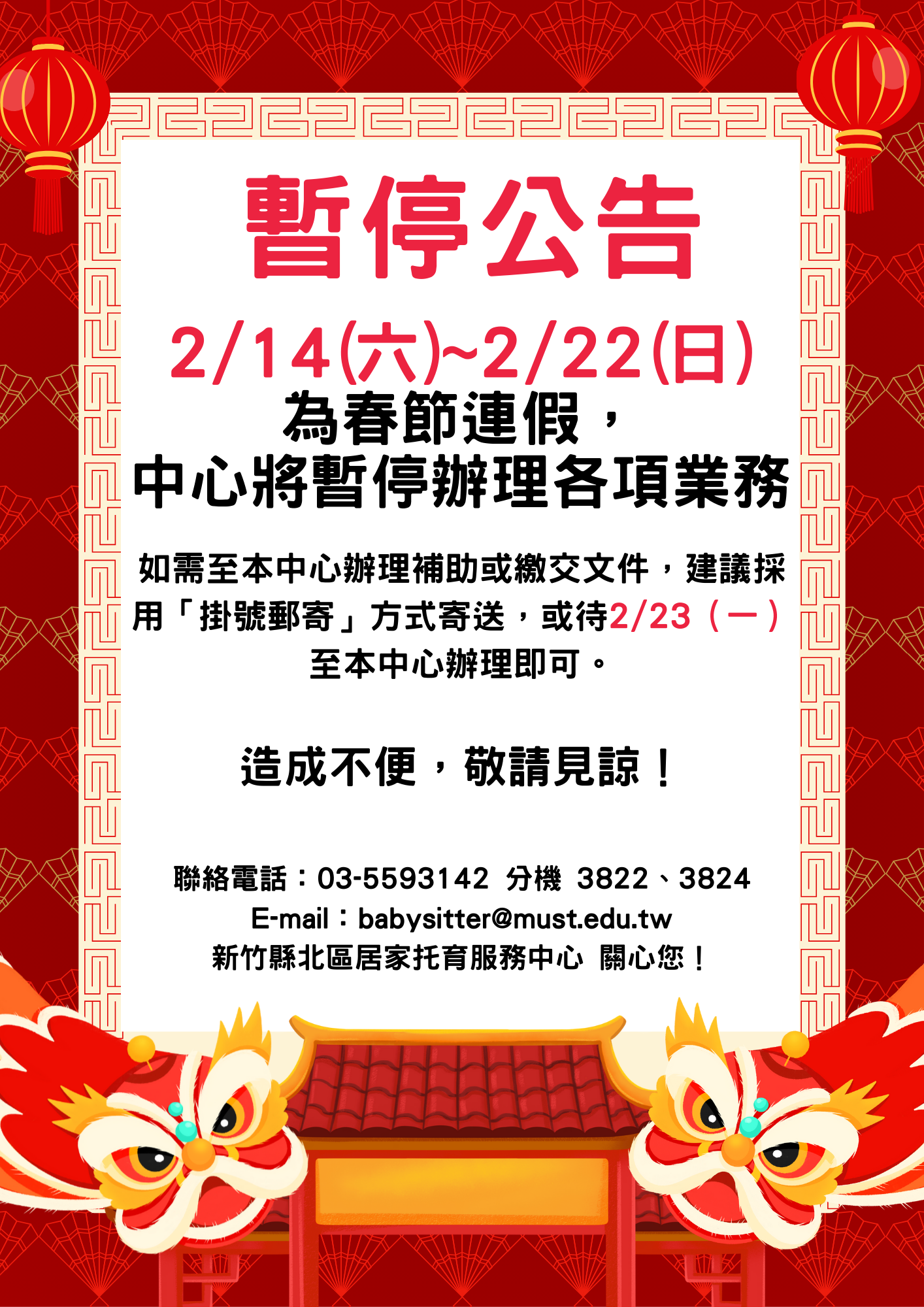 【暫停公告】2月14日(六)至2/22(日)為春節連假,中心將暫停各項服務。