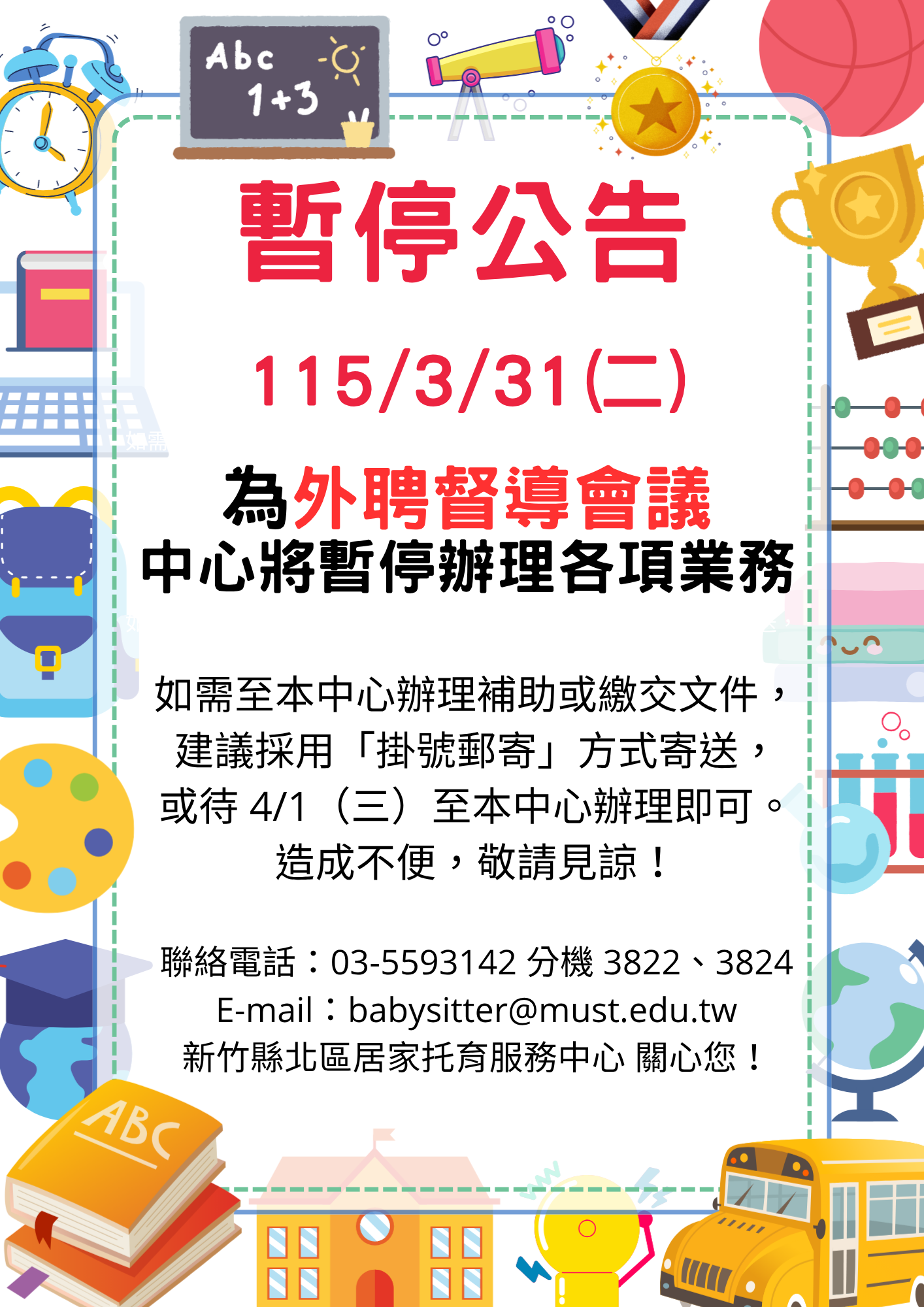 【暫停公告】115/3/31(二)為外聘督導會議,中心將暫停各項服務。