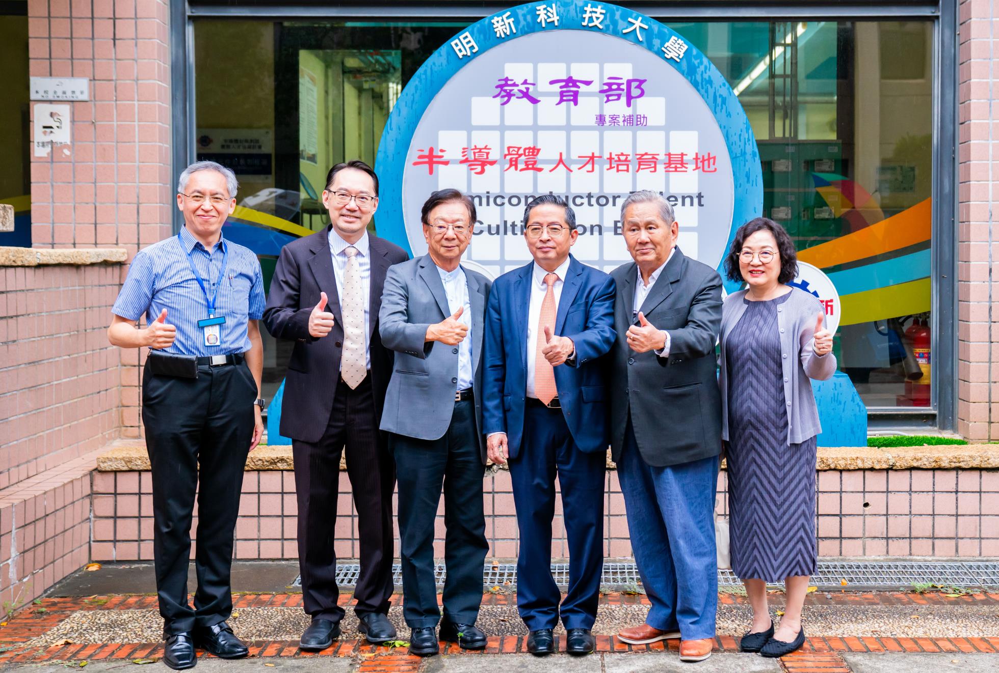 ▲CT Group董事長Tran Kim Chung(右三)、互貴興業董事長暨明新科技大學校務顧問宣明智(左三)與勇源教育發展基金會CEO冼文舉先生(右二)一行參訪明新科技大學半導體人才培育基地並於基地前留念