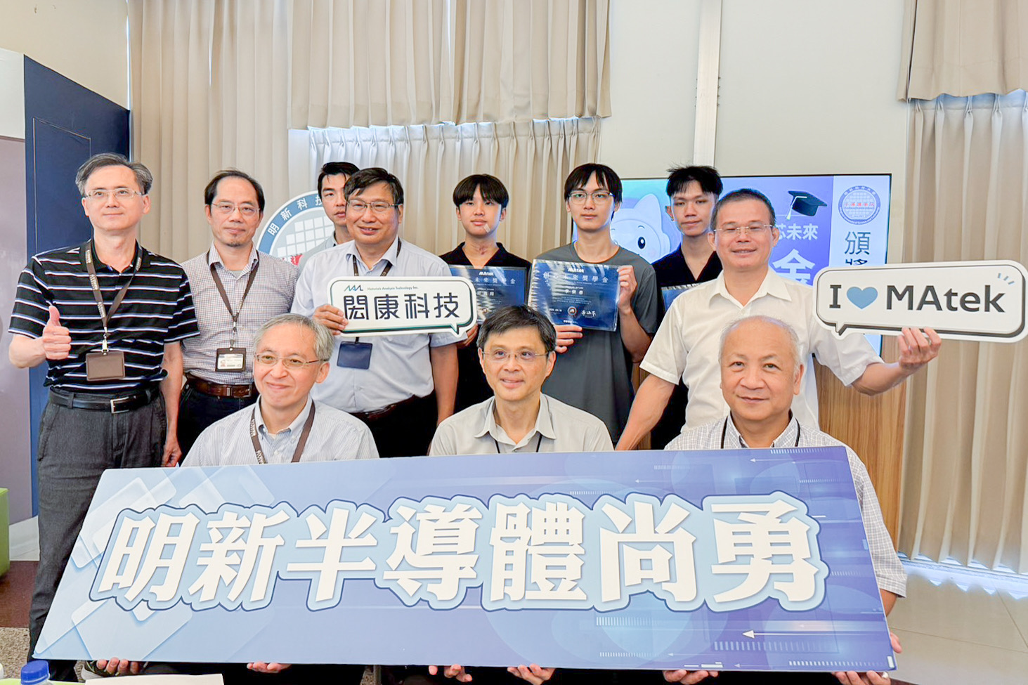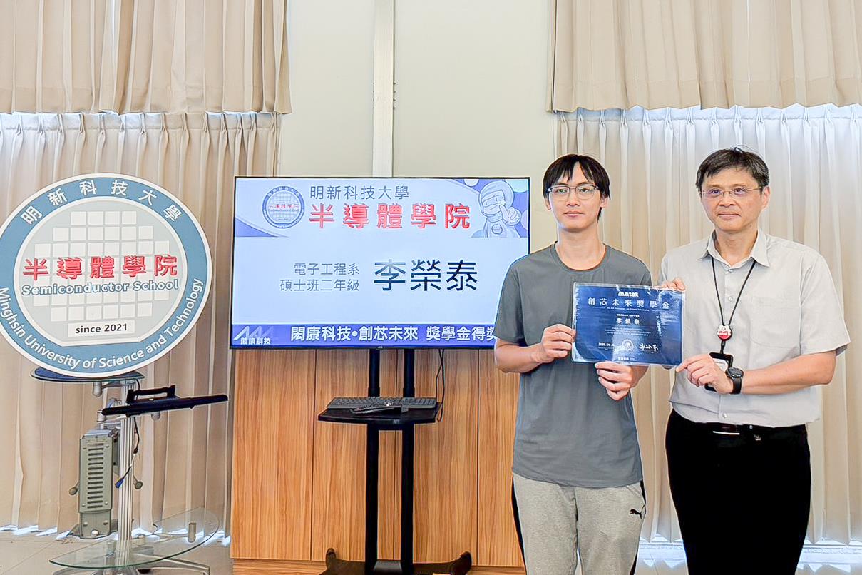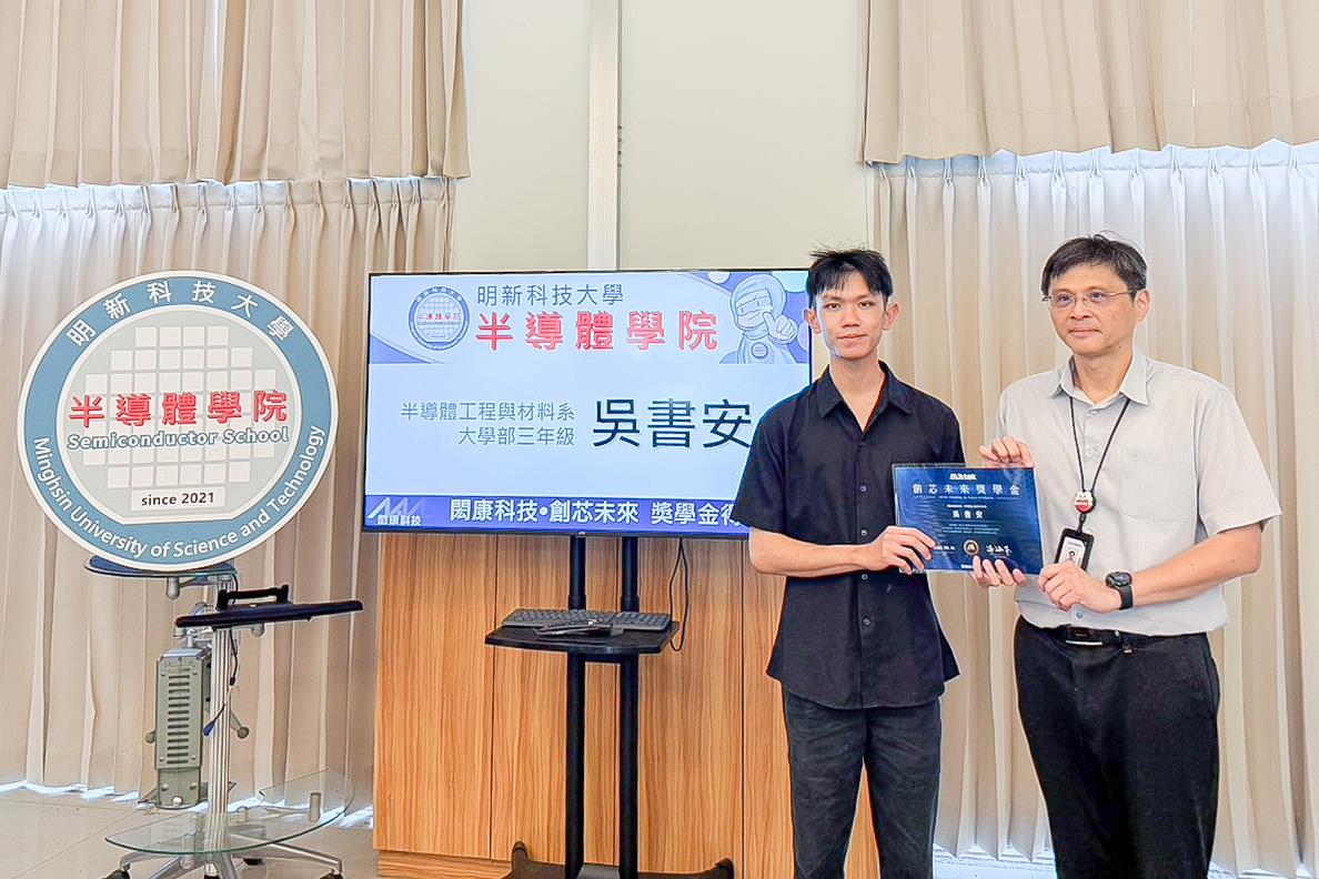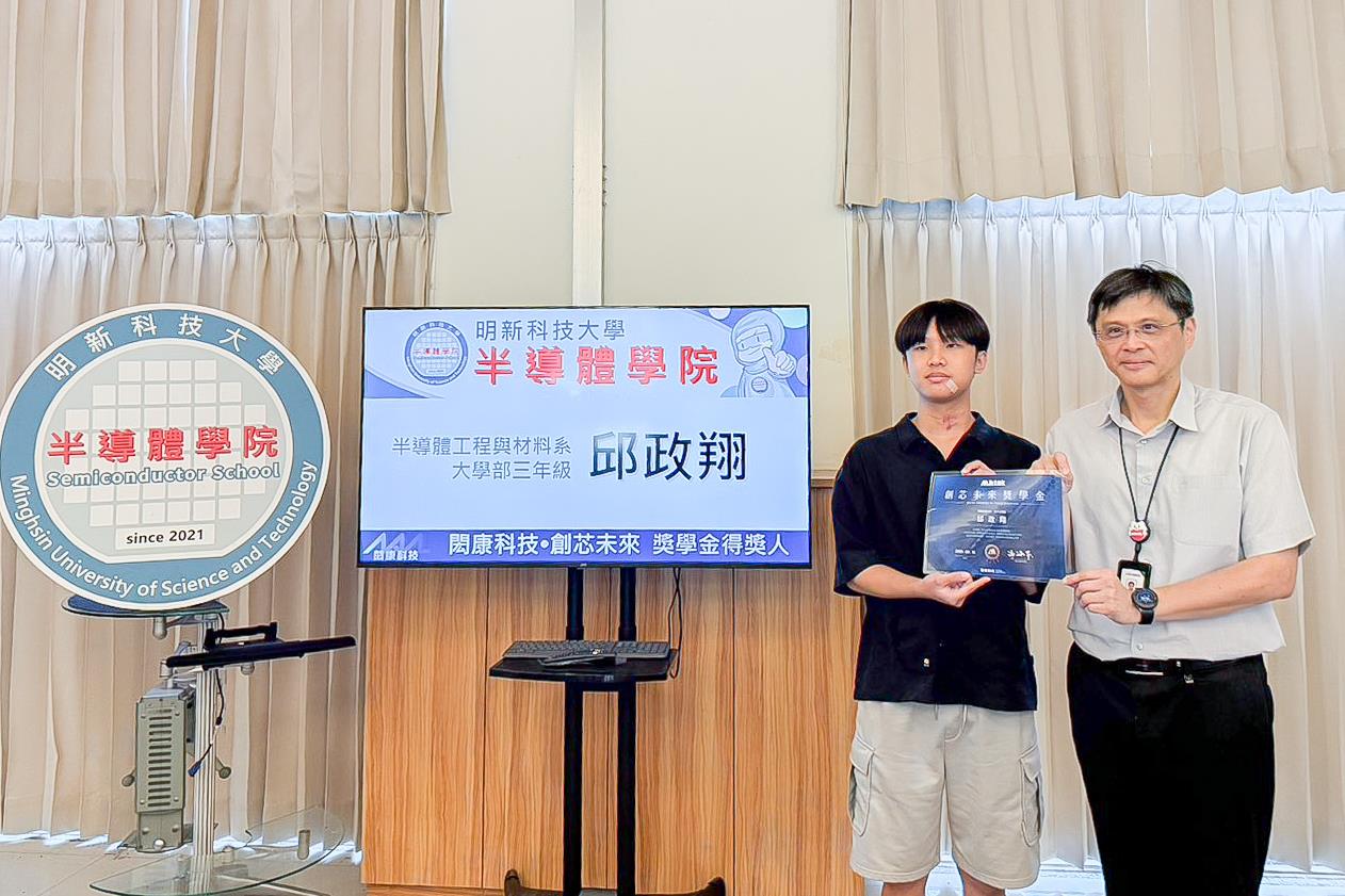 明新科技大學半導體工程與材料系大三吳書安、電子工程系碩二李榮泰及大三邱政翔三位同學,憑藉優異的專業素養、研究成果與發展潛力,榮獲「114年度閎康科技創芯未來獎學金」。該獎學金由閎康科技股份有限公司設立,今年僅頒發予全國五所科技大學的菁英學生,三位明新學子能在競爭激烈的甄選過程中脫穎而出,充分展現明新科大在半導體與電子領域的人才培育成果。頒獎典禮於2025年9月25日上午在明新科大校內舉行頒獎。