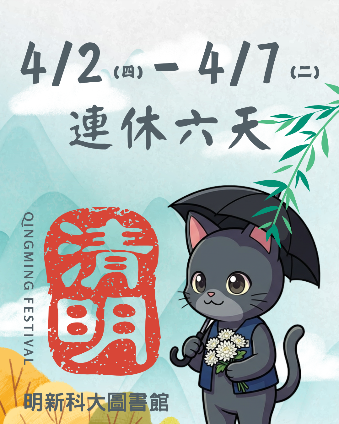【公告】清明連假圖書館休館六天:115年4月2日(星期四)至 115年4月7日(星期二)