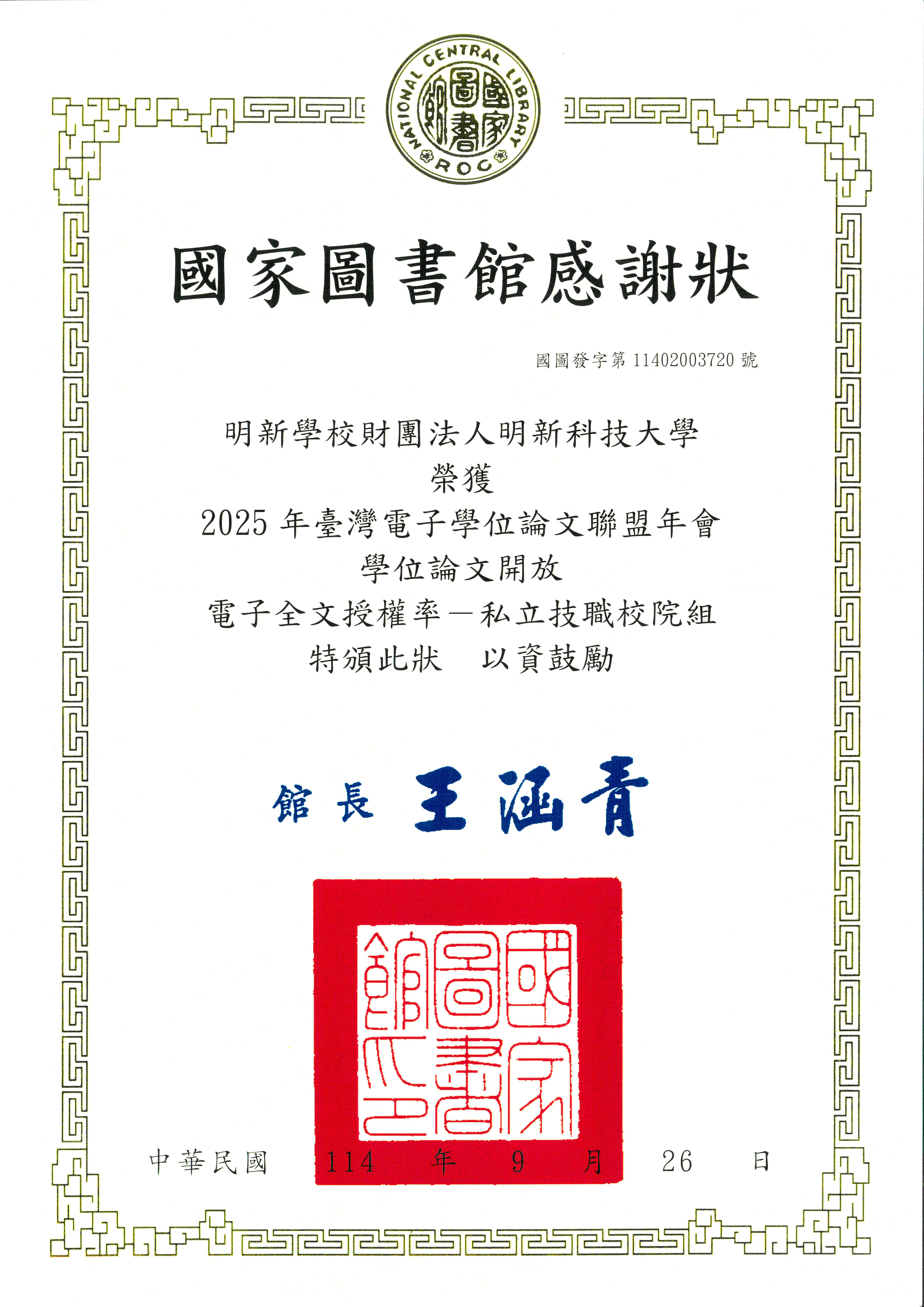 【圖書館】本校獲贈2025年「台灣電子學位論文聯盟年會」感謝狀