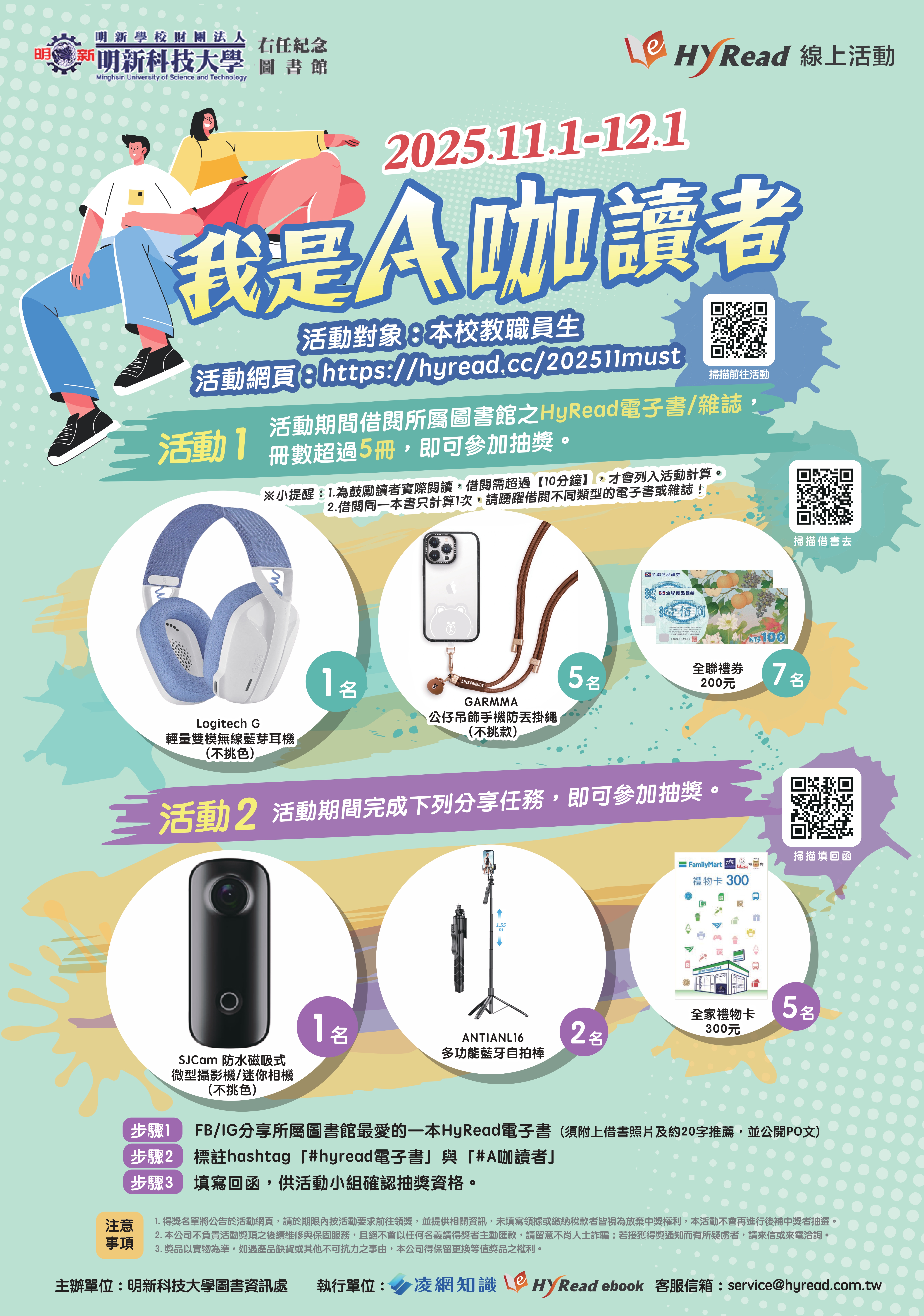 HyRead電子書平台收錄全台最豐富電子書,身為A咖讀者的你,一定不會錯過! 活動期間借書還能抽獎,快來參加拿獎品吧! 活動名稱: 我是A咖讀者 活動時間:2025/11/1-12/1 活動對象:本校教職員工生 借書分享就能抽好禮,身為A咖讀者的你一定不會錯過吧! 想試試你的好運嗎?那就趕快來參加吧! 活動連結: https://hyread.cc/202511must