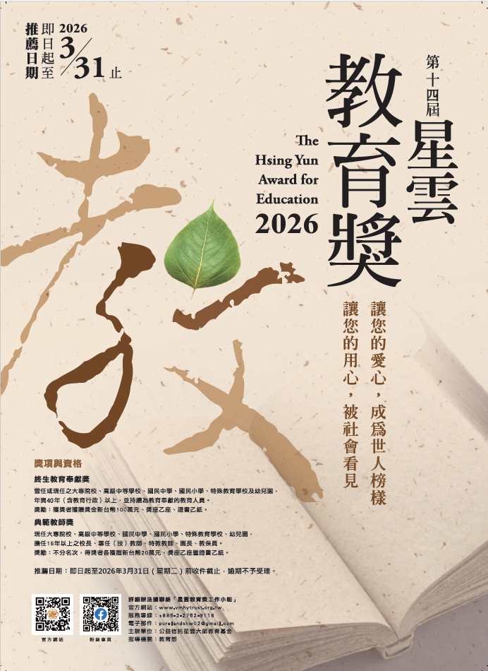 主 旨: 檢送公益信託星雲大師教育基金辦理「2026年第十四屆星雲教育獎」遴選辦法及海報各1份,請協助轉發並鼓勵所屬教師踴躍參與,請查照。