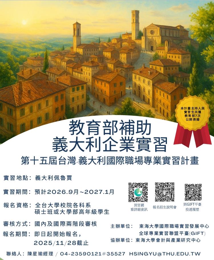 【實習招募】東海大學辦理「第十五屆台灣-義大利國際職場專業實習計畫」