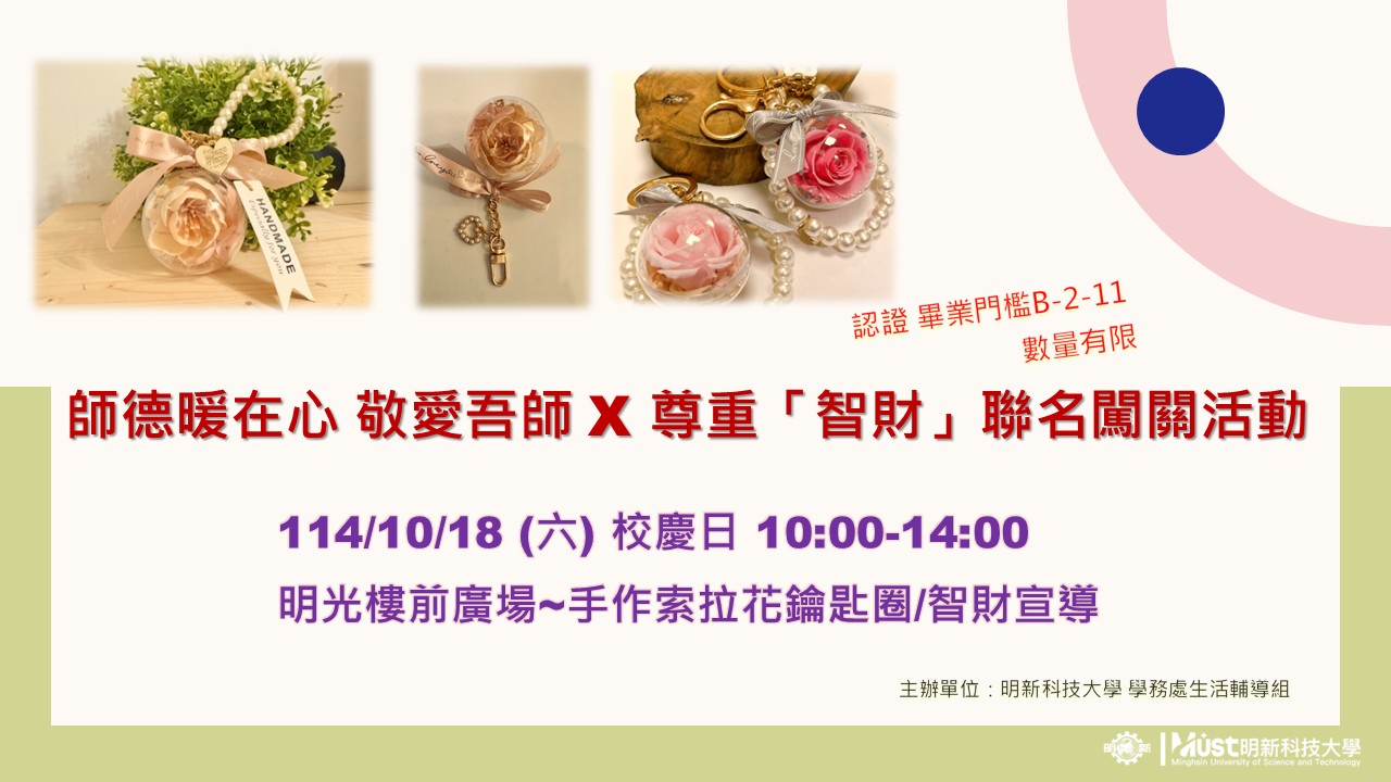 114/10/18 (六) 校慶日 10:00-14:00 明光樓前廣場~手作索拉花鑰匙圈/智財宣導
