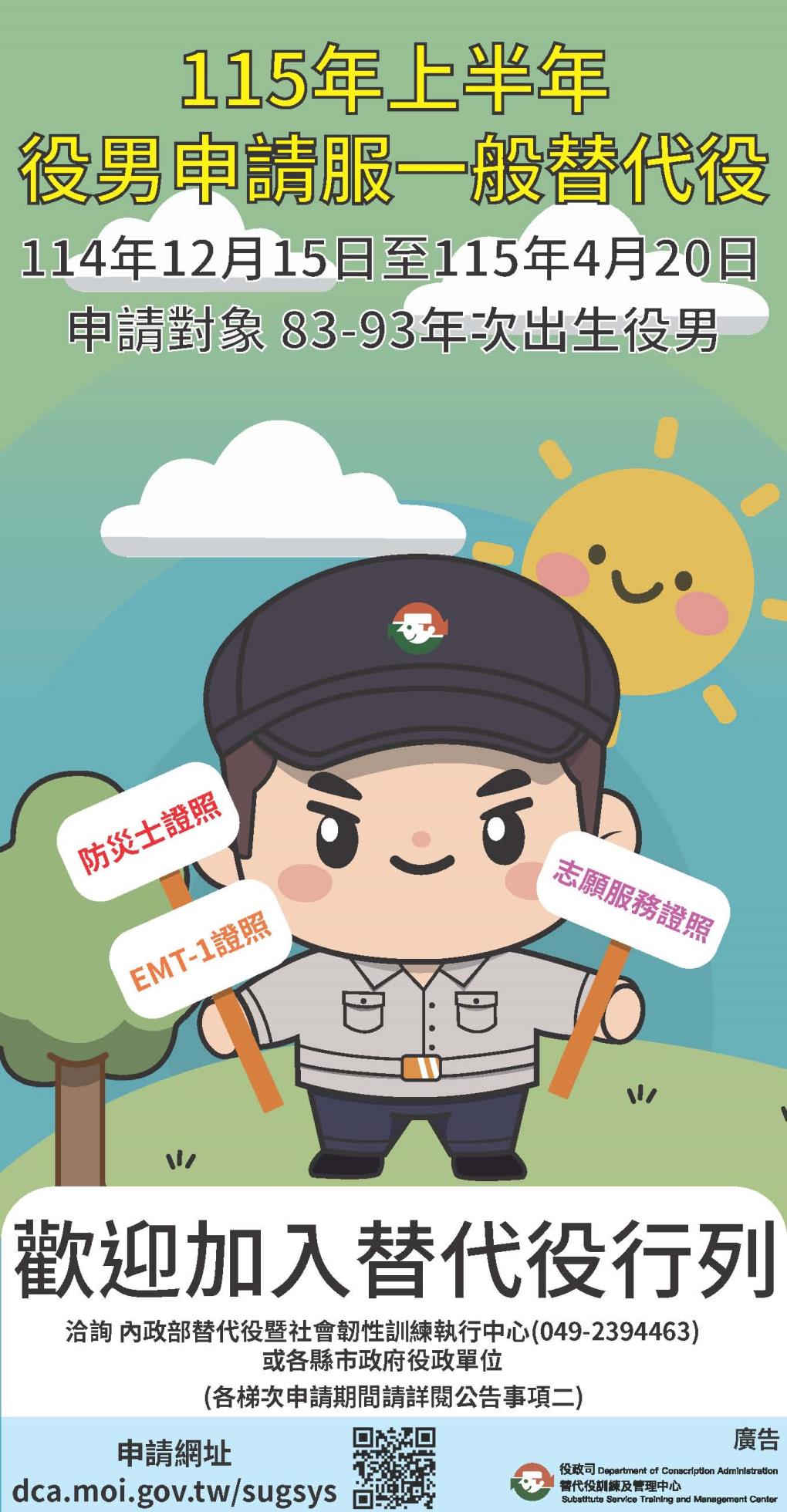 115年上半年役男申請服一般替代役甄選作業規定(詳閱附件公告)