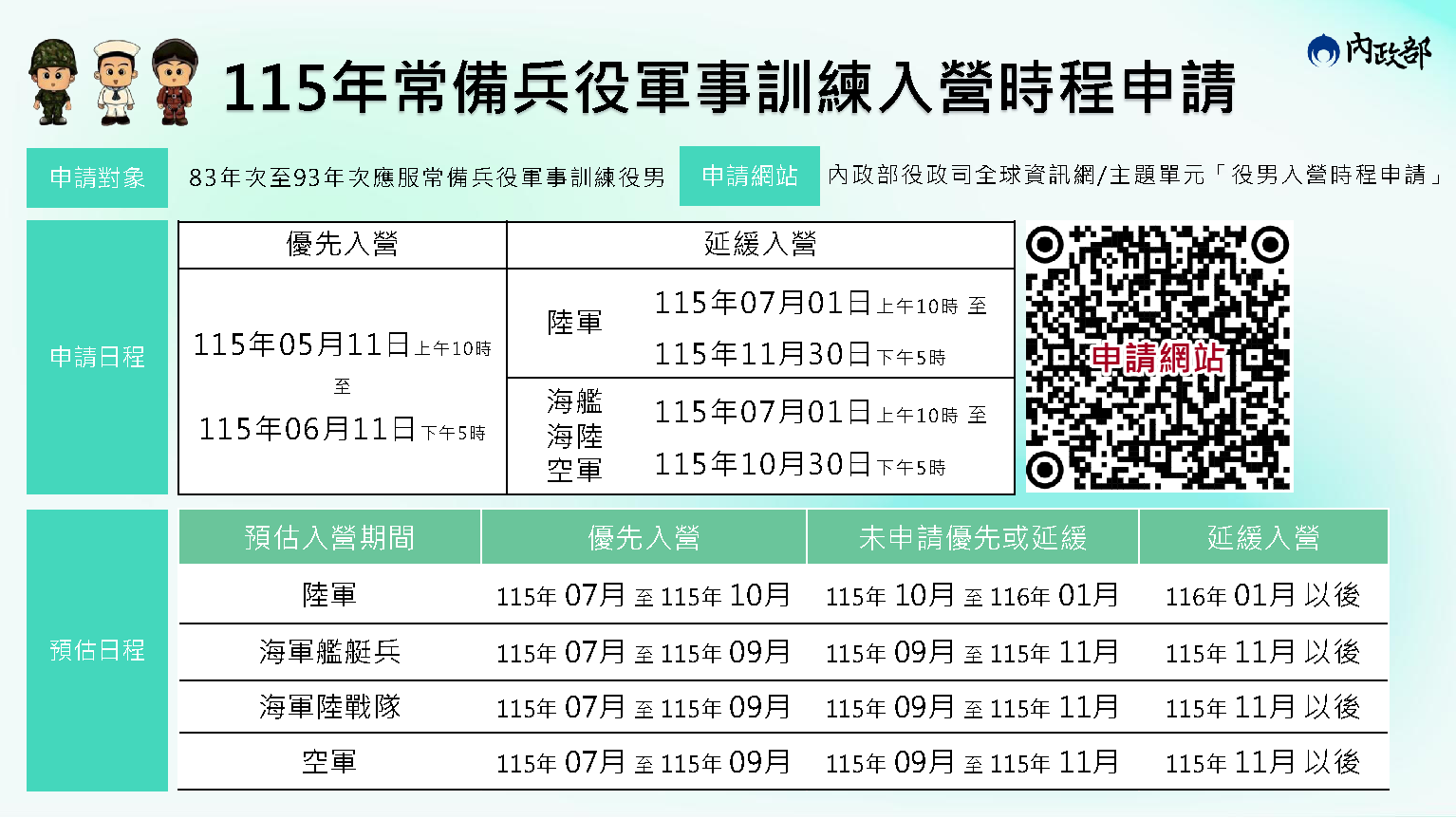 內政部「115年應接受常備兵役軍事訓練役男(83年次至93年次),申請優先入營、延緩入營之對象條件及相關作業規定」公告