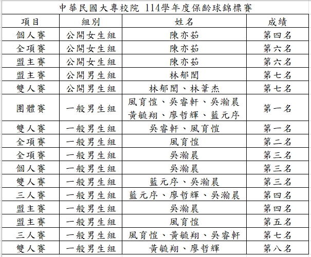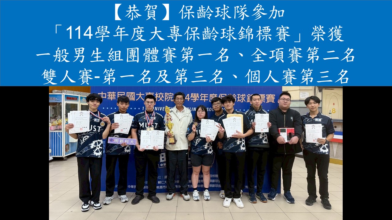 【恭賀】保齡球隊參加「114學年度大專校院保齡球錦標賽」 榮獲一般男生組團體賽第一名、全項賽第二名、雙人賽第一名及第三名、個人賽第三名