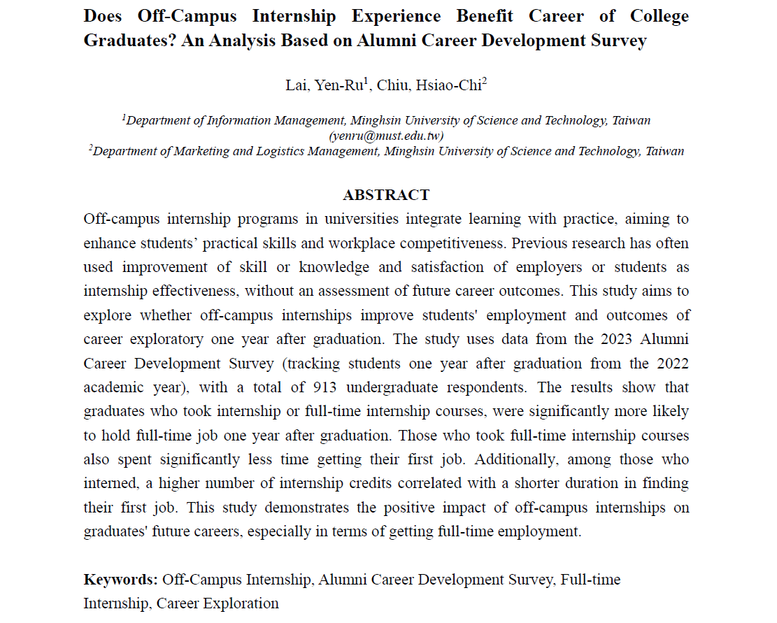 【114年度】Does Off-Campus Internship Experience Benefit Career of College Graduates? An Analysis Based on Alumni Career Development Survey