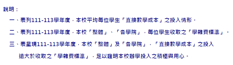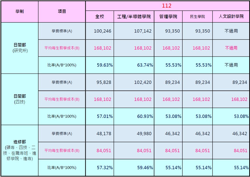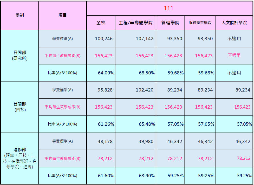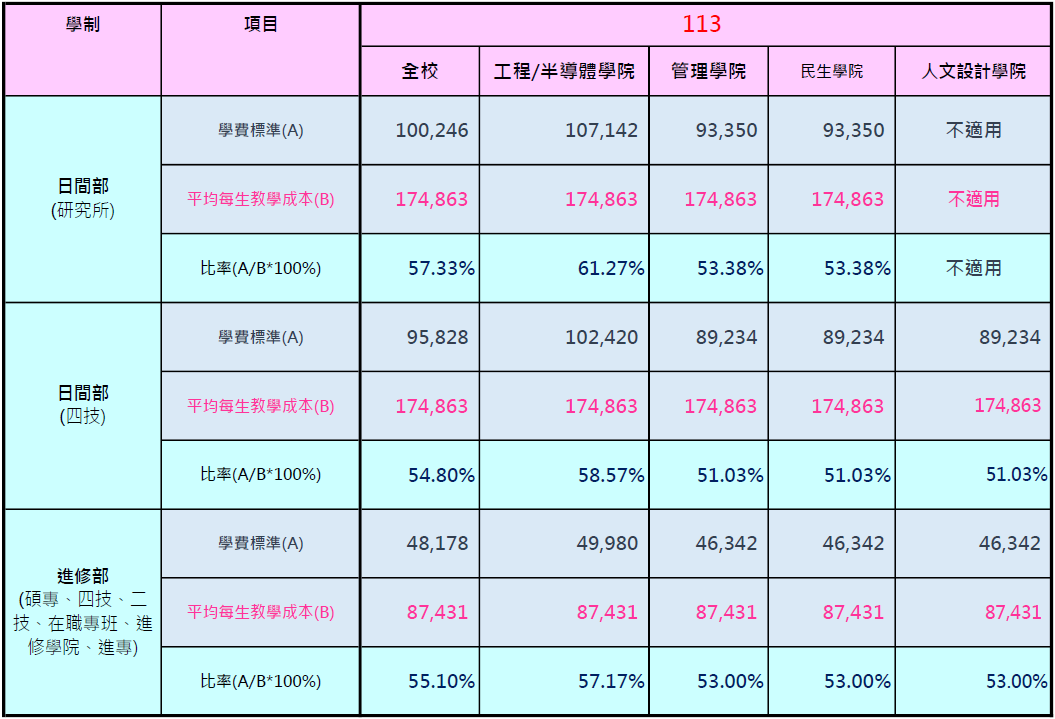 學校及各學院學雜費標準占平均每生佔教學成本比例