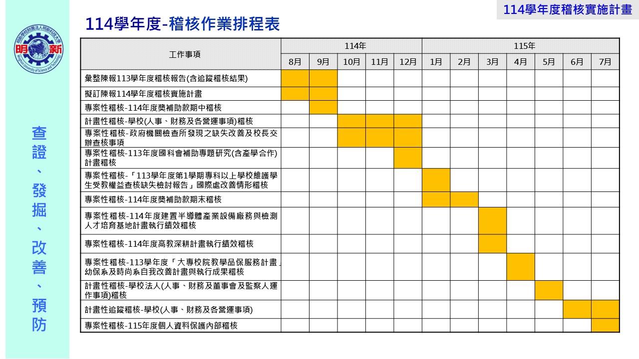 稽核室依據本校「內部控制制度實施辦法」及「內部控制制度稽核委員會設置暨作業要點」相關規定,訂定「114學年度內部控制制度稽核實施計畫」。「114學年度內部控制制度稽核實施計畫」已於114年9月10日內部控制制度稽核委員會第1次稽核工作會議審議通過,並於114年10月2日經校長核定後實施。本校內部控制制度稽核委員會依「114學年度內部控制制度稽核實施計畫」,執行內部控制制度之稽核作業。