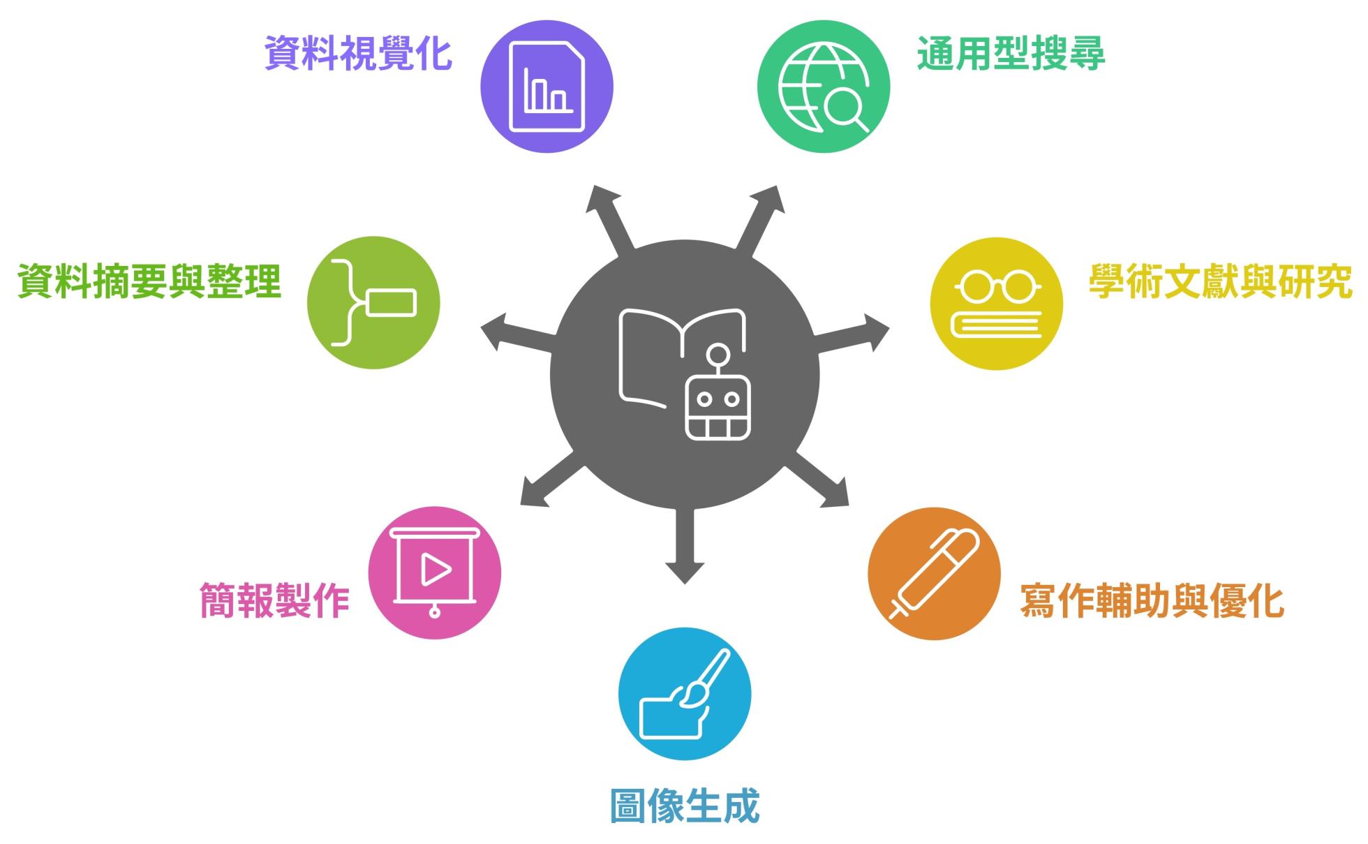 介紹一系列AI教學工具,涵蓋通用搜尋、學術文獻研究、寫作輔助、圖像生成、簡報製作、資料摘要與整理,以及資料視覺化等多元面向。